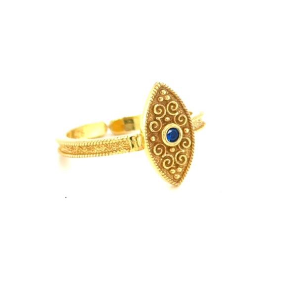 Ένα δαχτυλίδι βυζαντινό με μπλε ζιργκόν, φτιαγμένο από ασήμι (925°) επιχρυσωμένο.