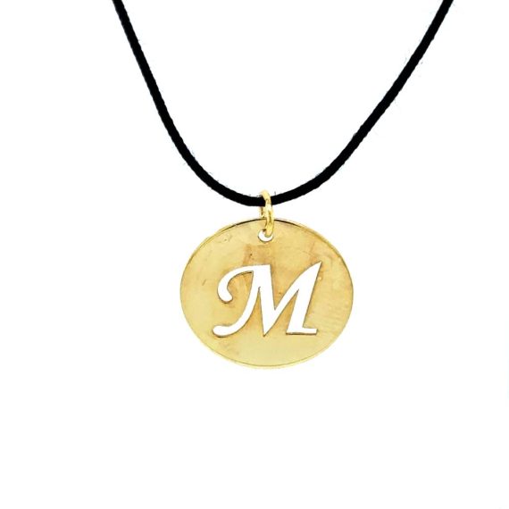 Ένα μενταγιόν μονόγραμμα Μ άπο χρυσό Κ9 (375°). Το μενταγιόν συνοδεύεται από ένα μαύρο κορδόνι.