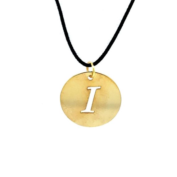 Ένα μενταγιόν μονόγραμμα I άπο χρυσό Κ9 (375°). Το μενταγιόν συνοδεύεται από ένα μαύρο κορδόνι.