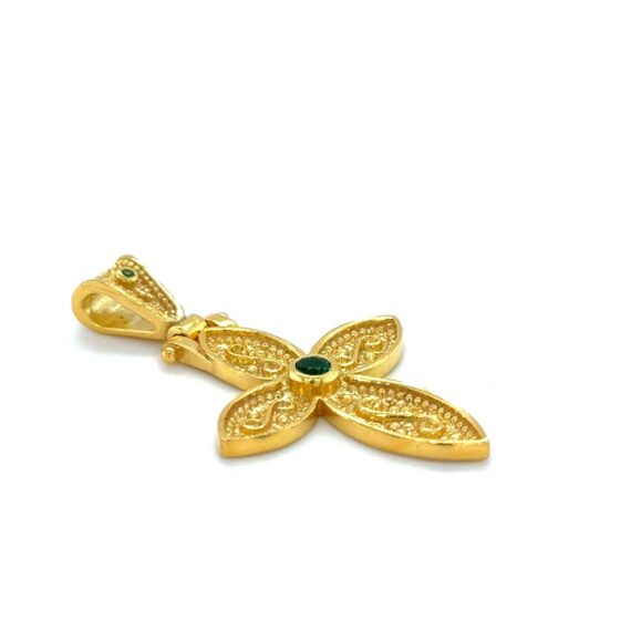 Ένας σταυρός βυζαντινός με πράσινο ζιργκόν, φτιαγμένο από ασήμι (925°) επιχρυσωμένο.