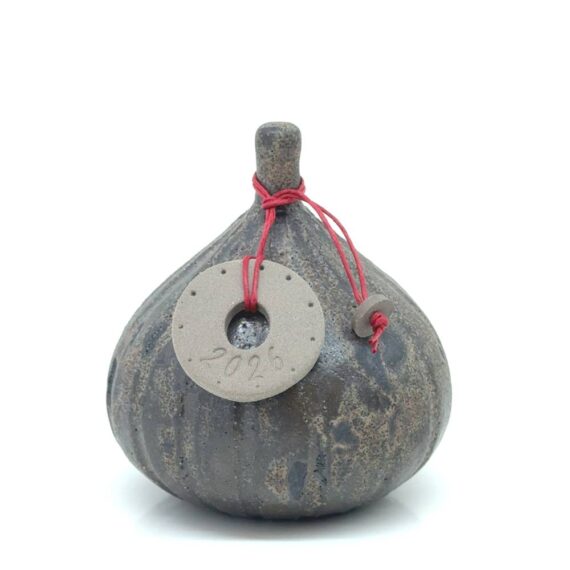 Ένα χειροποίητο χριστουγεννιάτικο σύκο 2026 σε γυαλιστερό καφέ χρωματισμό από το εργαστήριο κεραμικών ΤΡΕΙΣ ΓΡΑΜΜΕΣ. Τα χρώματα μπορεί να διαφέρουν σχετικά από την πραγματικότητα.
