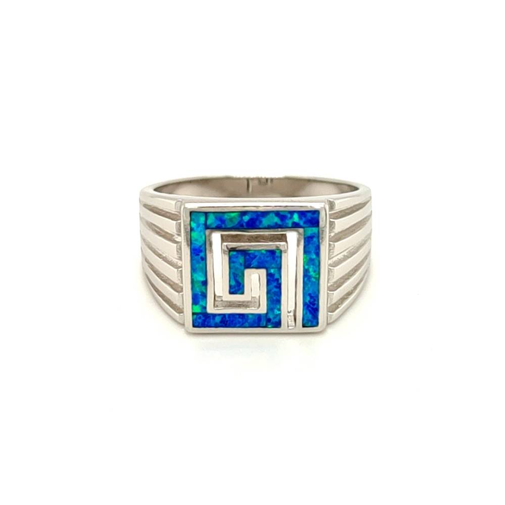 Ανδρικό δαχτυλίδι από ασήμι (925°) με σύμβολο Μαίανδρο με τεχνητό opal. Ο Μαίανδρος είναι το αρχαιότερο ελληνικό σύμβολο, Νίκης και Ενότητας, σύμβολο του Άπειρου και της Αιώνιας Ζωής. Εμπνευσμένος, κατά την άποψη κάποιων ακαδημαϊκών, από τις πολυάριθμες στροφές του ποταμού Μαιάνδρου. Ο Μαίανδρος χρησιμοποιείται σε αγγεία, ναούς, μνημεία, γλυπτά, αντικείμενα, πολεμικά όπλα, πανοπλίες και κοσμήματα.