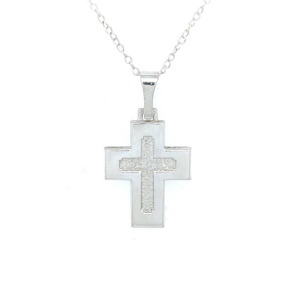 Ένα μενταγιόν σταυρός από ασήμι (925°) σε διάσταση 2,4 x 1,9 cm (χωρίς κρίκο), δεν περιλαμβάνεται η αλυσίδα.