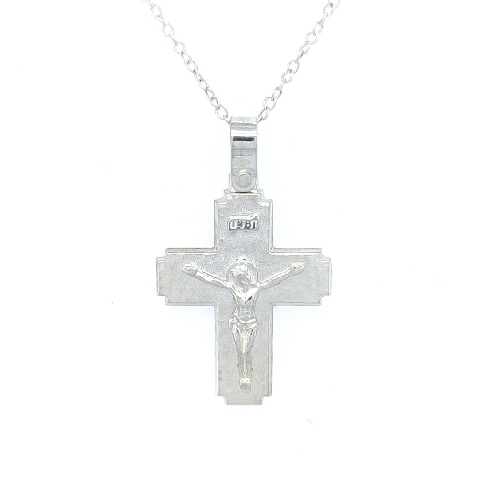 Ένα μενταγιόν σταυρός από ασήμι (925°) σε διάσταση 3,0 x 2,4 cm (χωρίς κρίκο), δεν περιλαμβάνεται η αλυσίδα.