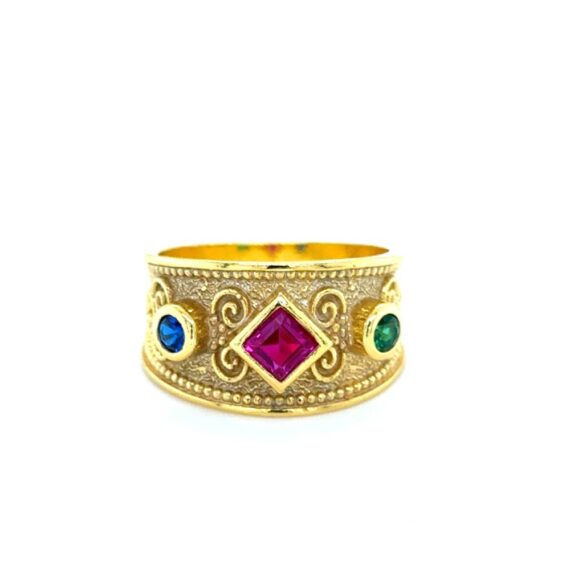 A Byzantine ring with red, green and blue zircon, made of silver (925°) gold plated.