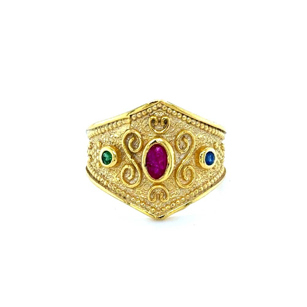 A Byzantine ring with red, green and blue zircon, made of silver (925°) gold plated.