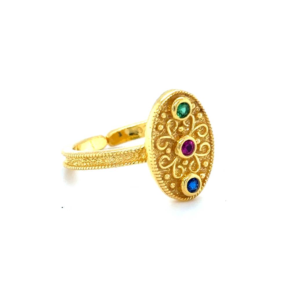 A Byzantine ring with red, green and blue zircon, made of silver (925°) gold plated.