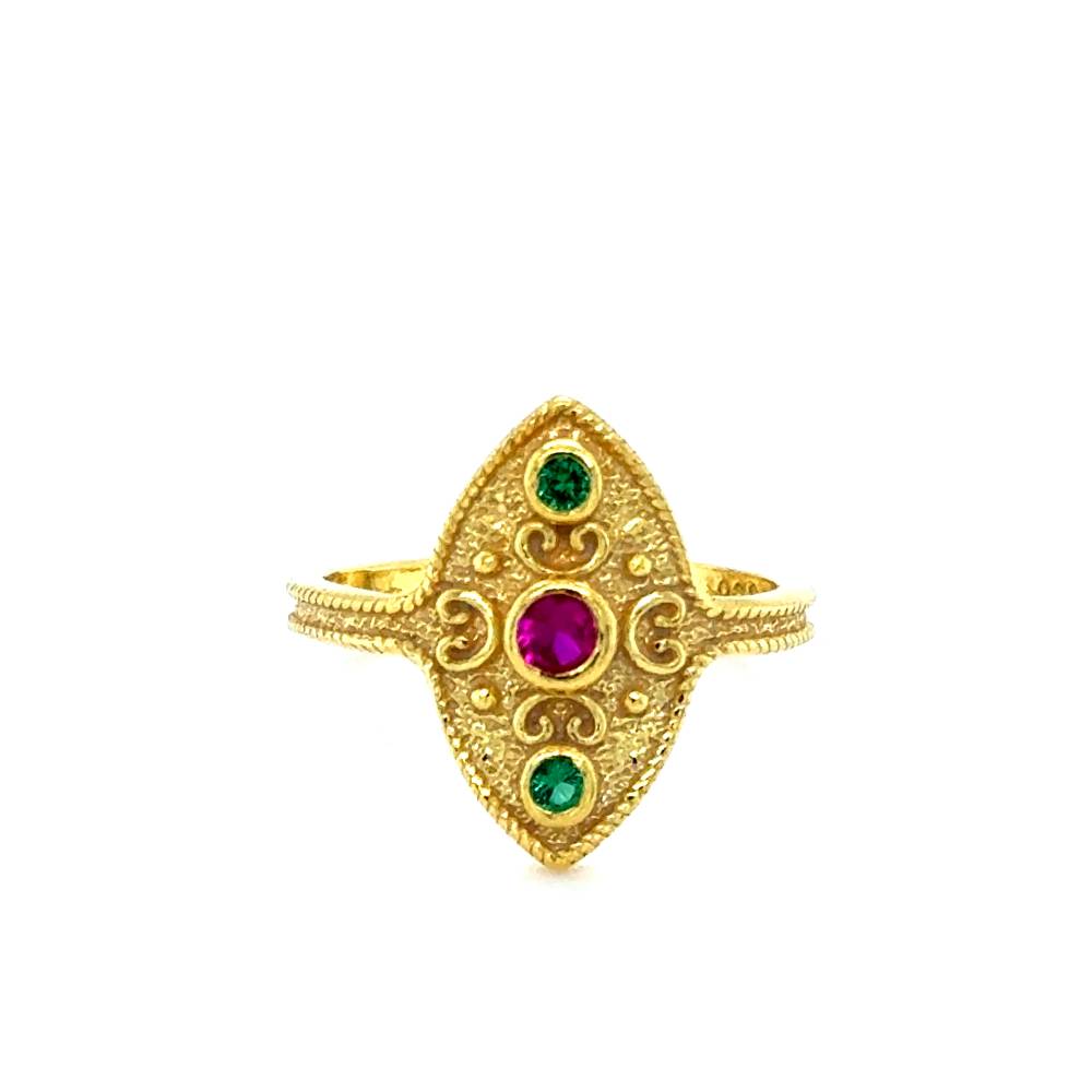 A Byzantine ring with red and green zircon, made of silver (925°) gold plated.