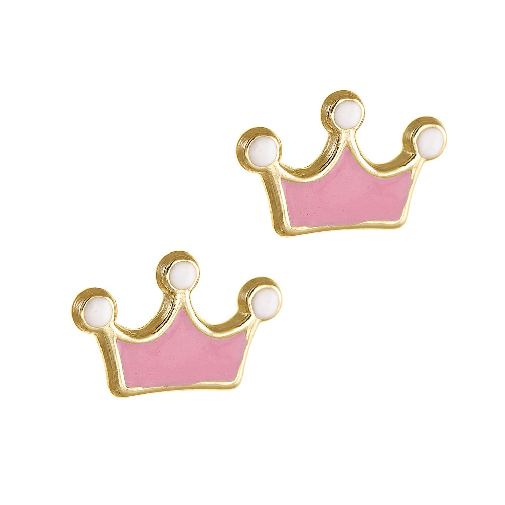 Children’s crown earrings in pink and white color, which are made of Gold K9 (375°).