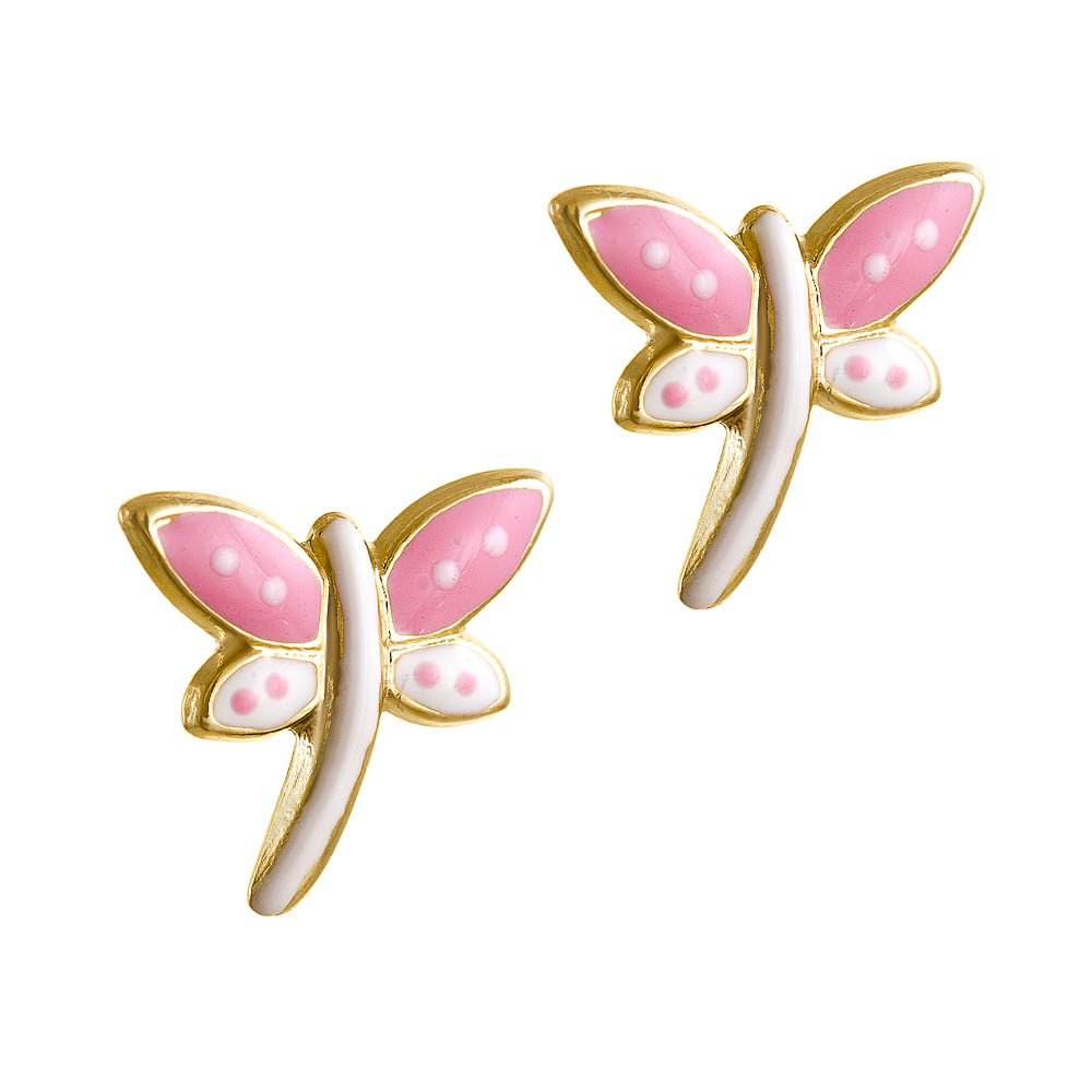 Children’s dragonfly earrings in pink and white color, which are made of Gold K9 (375°).
