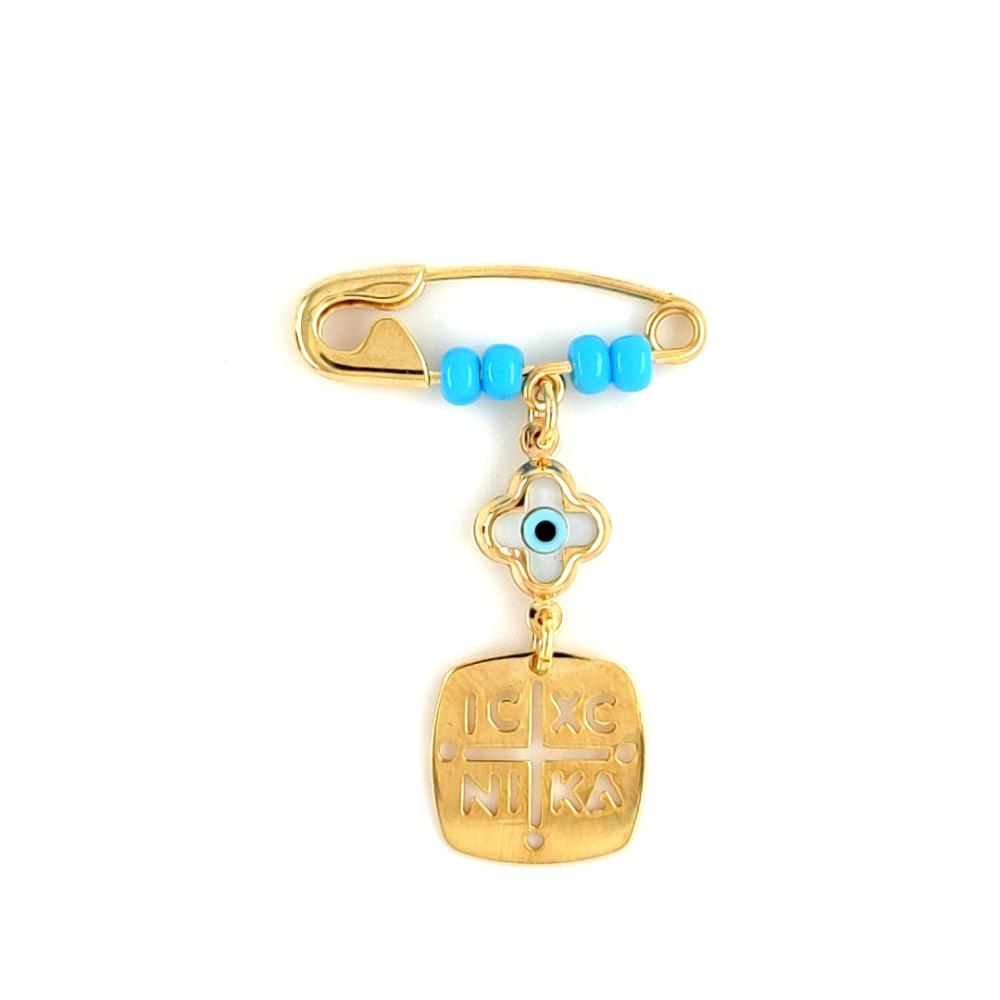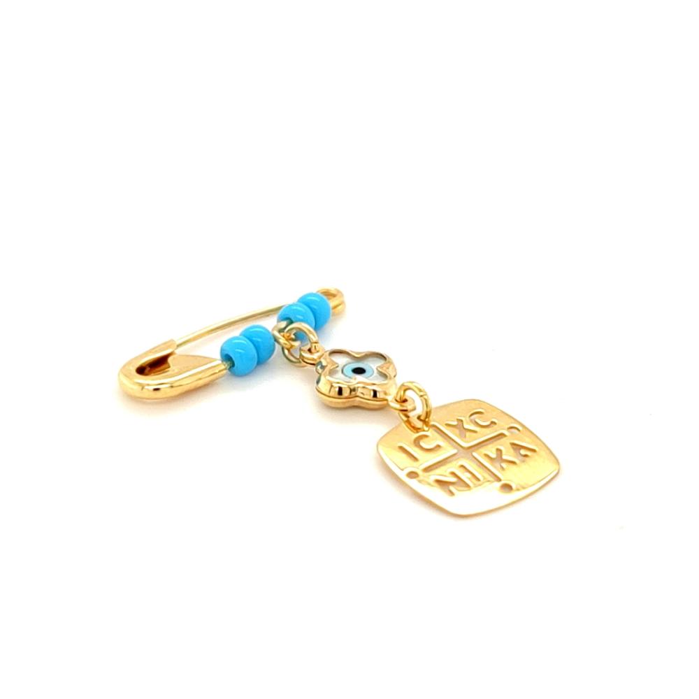 Children’s safety pin amulet, gold Κ9 (375°), Constantine and evil eye
