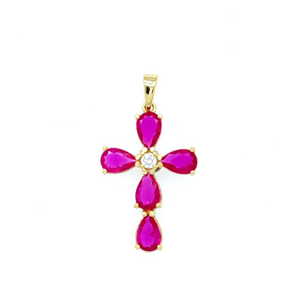 Cross with white/dark pink Zircon, K14 Gold (585°)