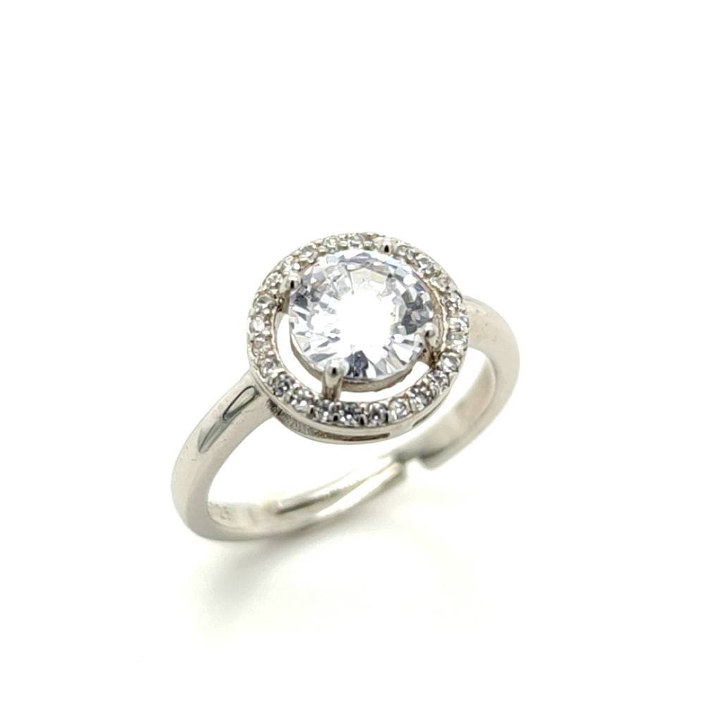 Ένα δαχτυλίδι ροζέτα με λευκό ζιργκόν, φτιαγμένο από ασήμι (925°).