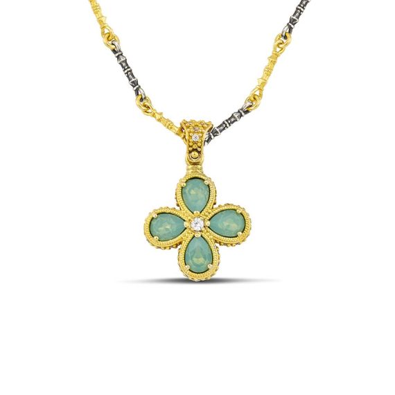 From the Dimitrios Exclusive Passatempo collection, a pendant that will capture your heart. Crafted from high-quality sterling silver, this pendant features ornate bezels plated in gold and tiny zircon accents. The focal point of the pendant is a stunning floral design, with intricately detailed petals featuring pear-shaped Swarovski crystals that will sparkle with every movement. The larger zircon gemstone in the center of the piece adds to the overall sophistication of the necklace. The pendant hangs from a stylish chain that combines silver and gold plating to create a two-tone effect, making it the perfect accessory for any outfit. Expert craftsmanship and attention to detail make this necklace a must-have for any jewelry lover’s collection.
