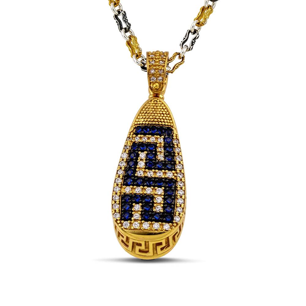 Pendant with handmade tricolor chain inspired by the ancient Greek meander symbol. An elegant descreet piece of jewelry made of sterling silver with gold-plated touches and decorated with white and blue zircon.