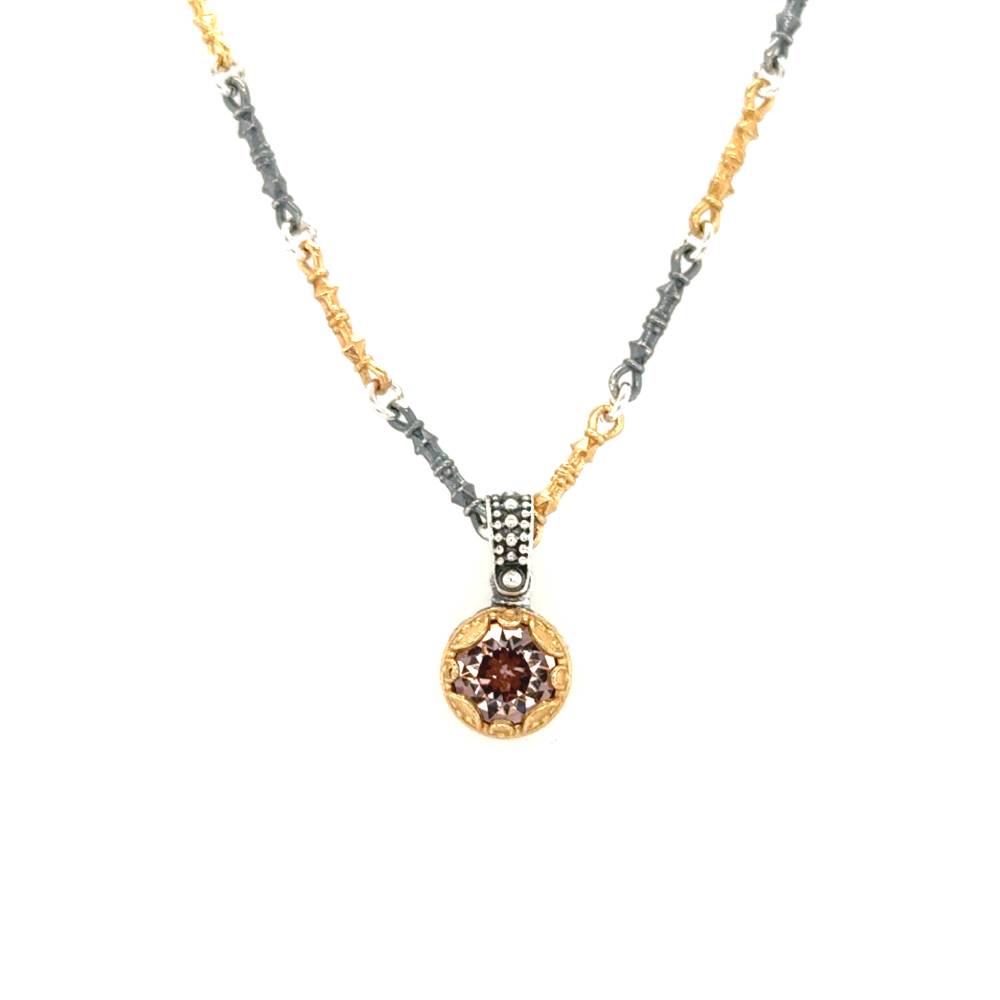 Από τη συλλογή Passatempo, ένα ωραίο κρεμαστό μενταγιόν με στρογγυλή antique pink swarovski πέτρα σε περίτεχνο επίχρυσο στεφάνι. Συνδυάζεται τέλεια με δίχρωμη χειροποίητη αλυσίδα για κάθε εμφάνιση πάντα με την υπογραφή Dimitrios Exclusive.