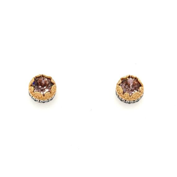 Από τη συλλογή Passatempo, ένα διακριτικό στρογγυλό ζευγάρι σκουλαρίκια με κρύσταλλο antique pink Swarovski πέτρα σε περίτεχνο επίχρυσο στεφάνι.