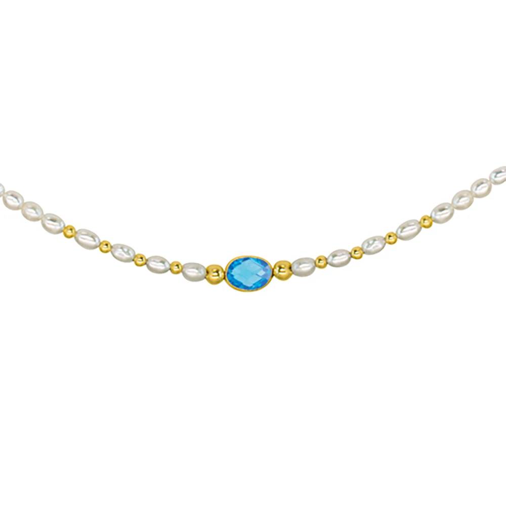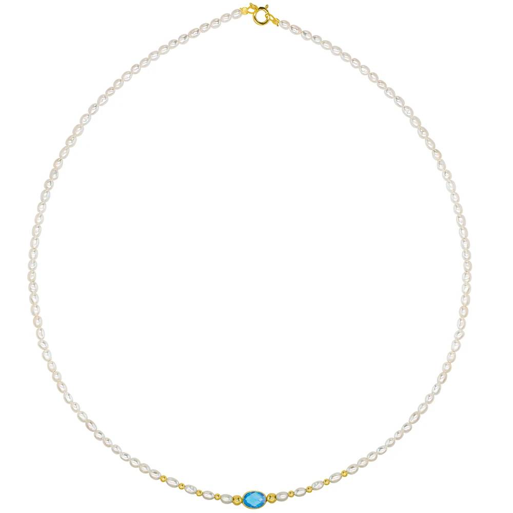A Long shaped Fresh Water Pearl white freshwater pearl necklace. In the center of the necklace is a 5 x 7 mm Blue Topaz Cubic Zircon pendant set in K14 gold (585°). Between the pearls are 10 K14 (585°) gold balls, 8 of which are 2 mm in diameter and 2 that embrace the 3 mm diameter Blue Topaz Cubic Zircon.