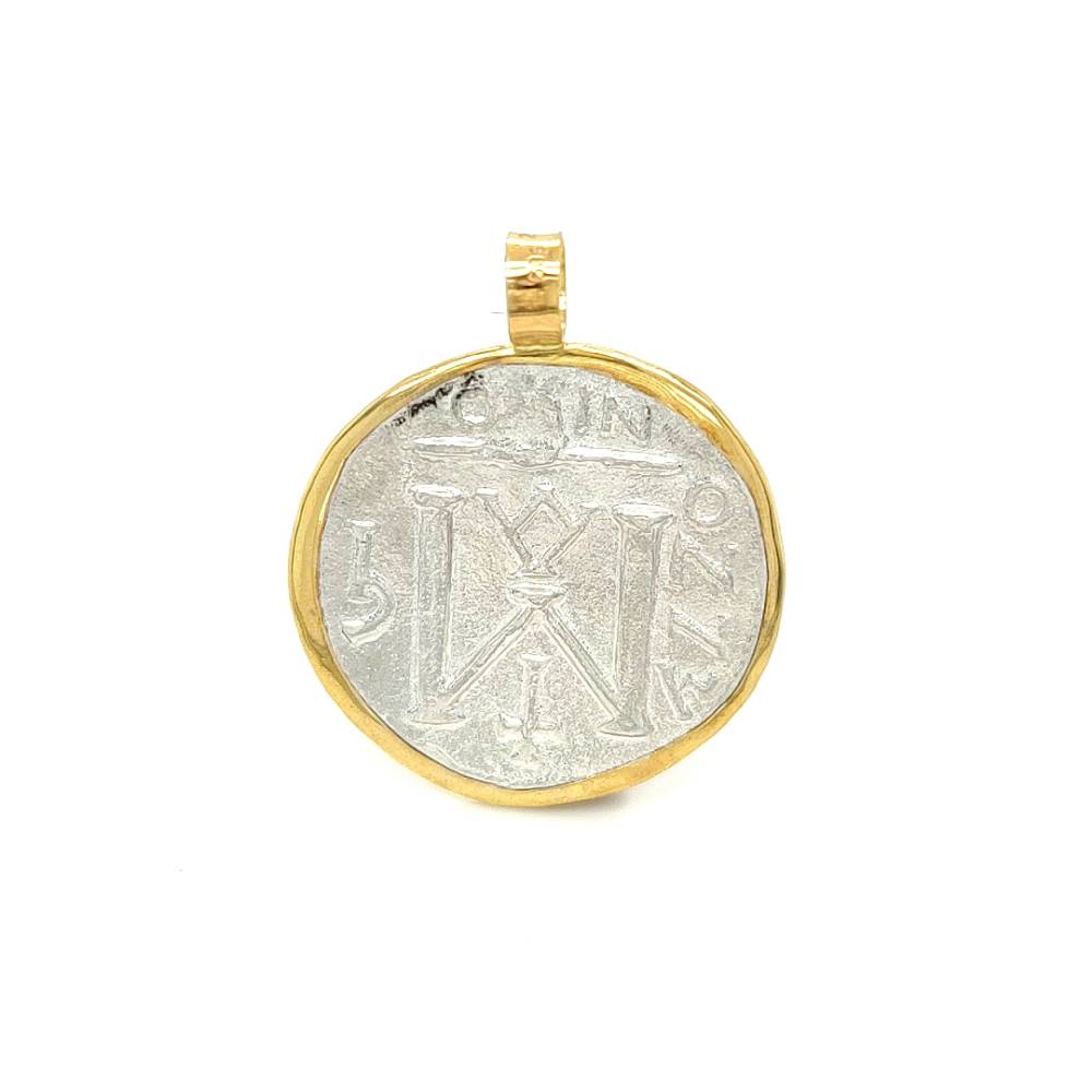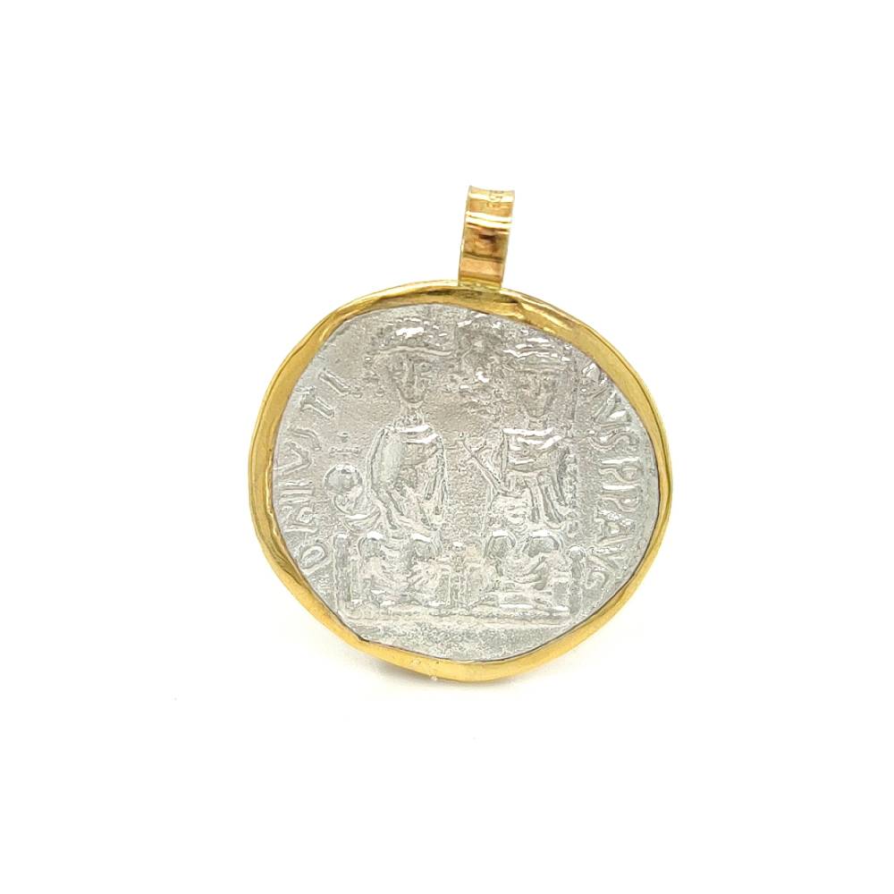 Ένα μενταγιόν φυλαχτό διπλής όψεως Κωνσταντινάτο, από ασήμι (925°) και στεφάνι από χρυσό K14 (585°).