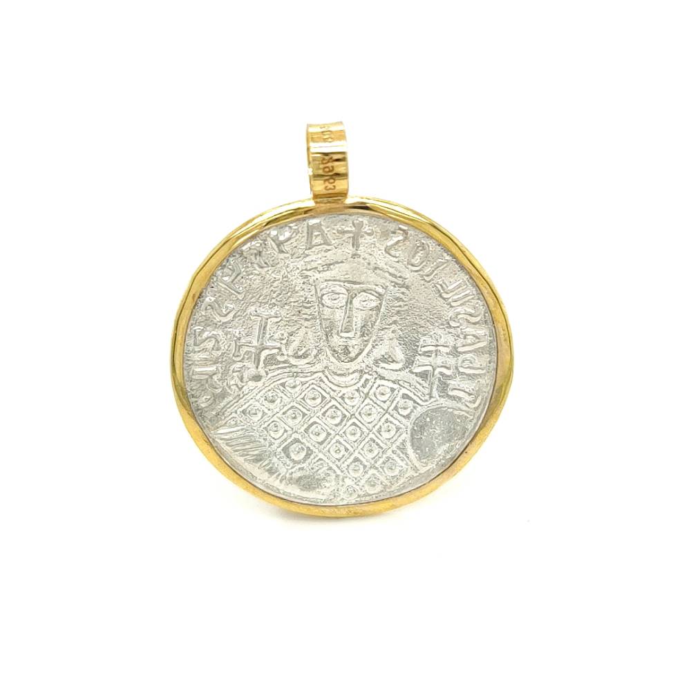 Ένα μενταγιόν φυλαχτό διπλής όψεως Κωνσταντινάτο, από ασήμι (925°) και στεφάνι από χρυσό K14 (585°).