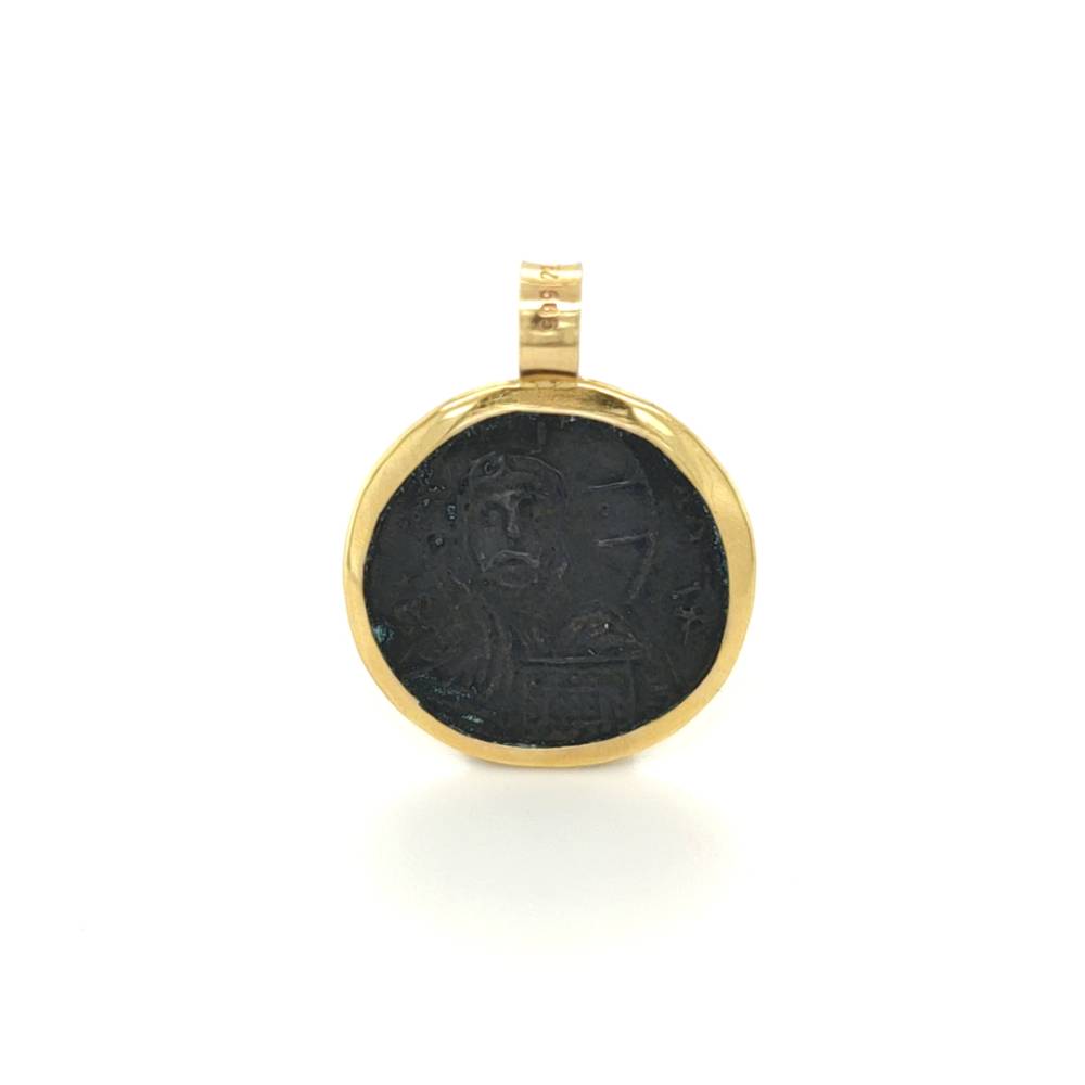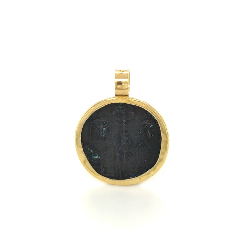 Ένα μενταγιόν φυλαχτό διπλής όψεως Κωνσταντινάτο, από χαλκό και στεφάνι από χρυσό K14 (585°).