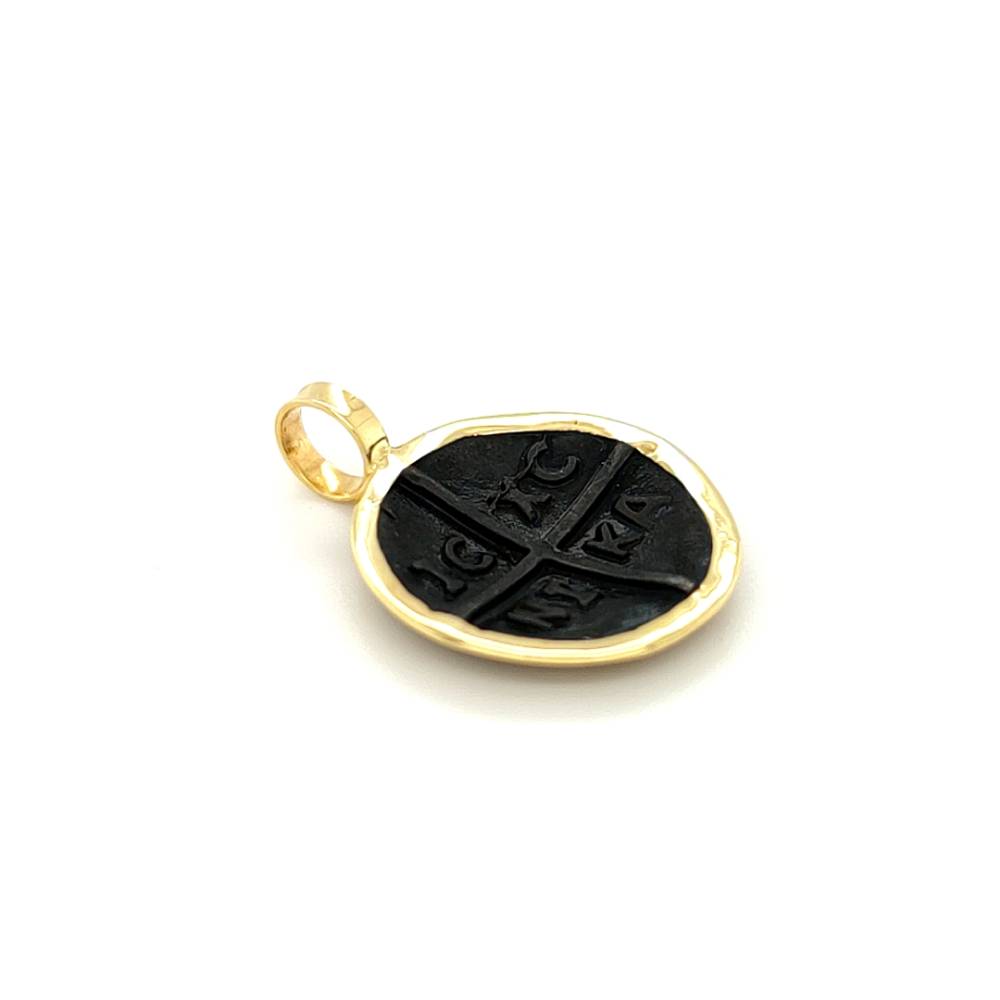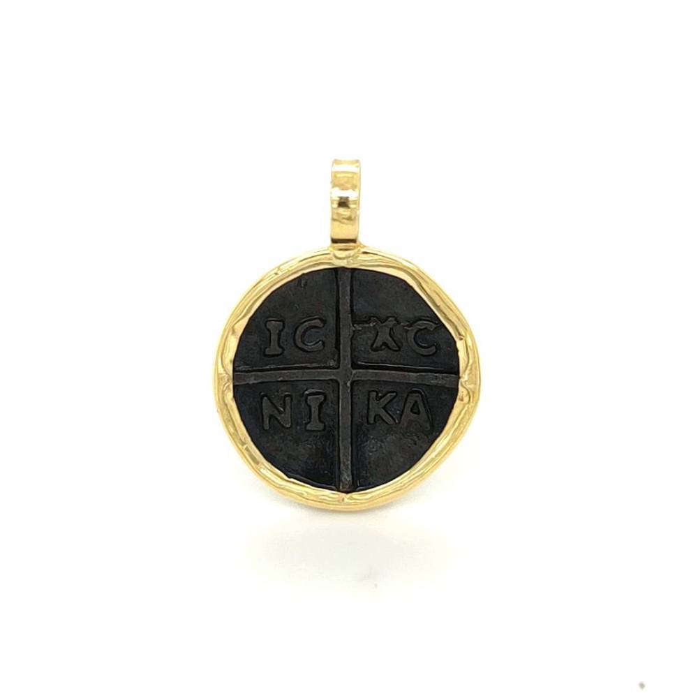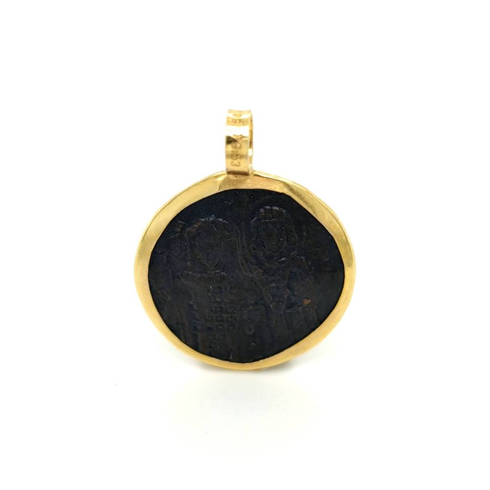 Ένα μενταγιόν φυλαχτό διπλής όψεως Κωνσταντινάτο, από χαλκό και στεφάνι από χρυσό K14 (585°).