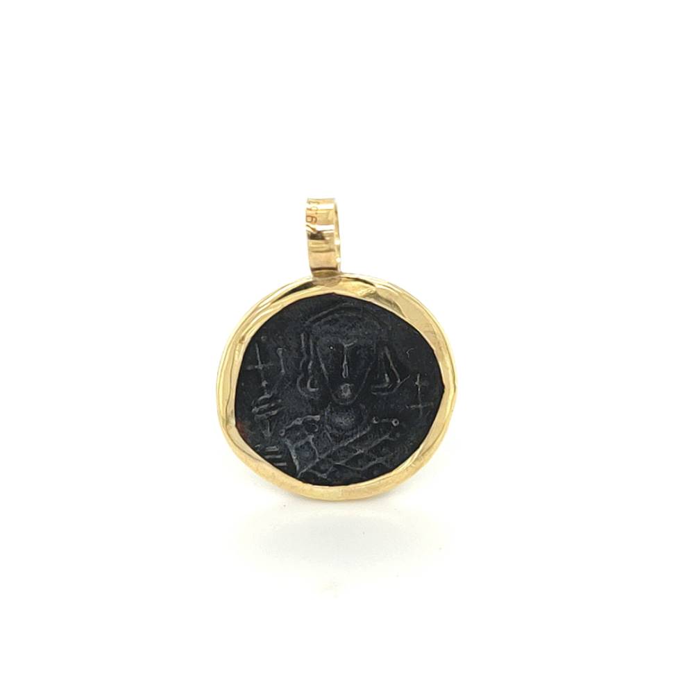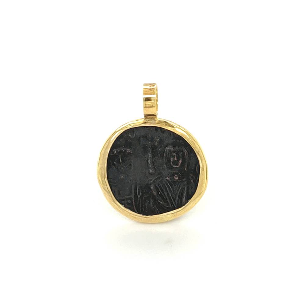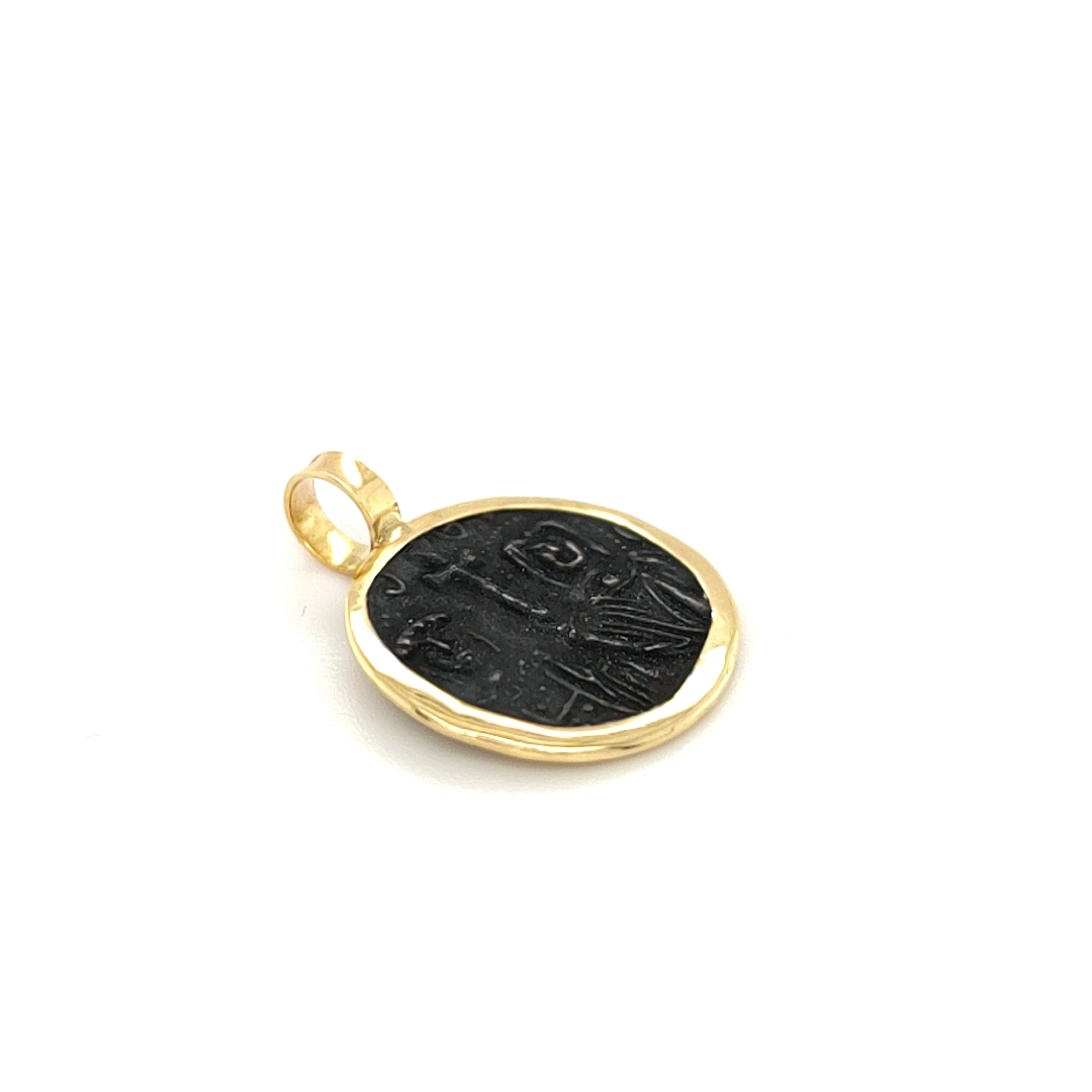 Ένα μενταγιόν φυλαχτό διπλής όψεως Κωνσταντινάτο, από χαλκό και στεφάνι από χρυσό K14 (585°).
