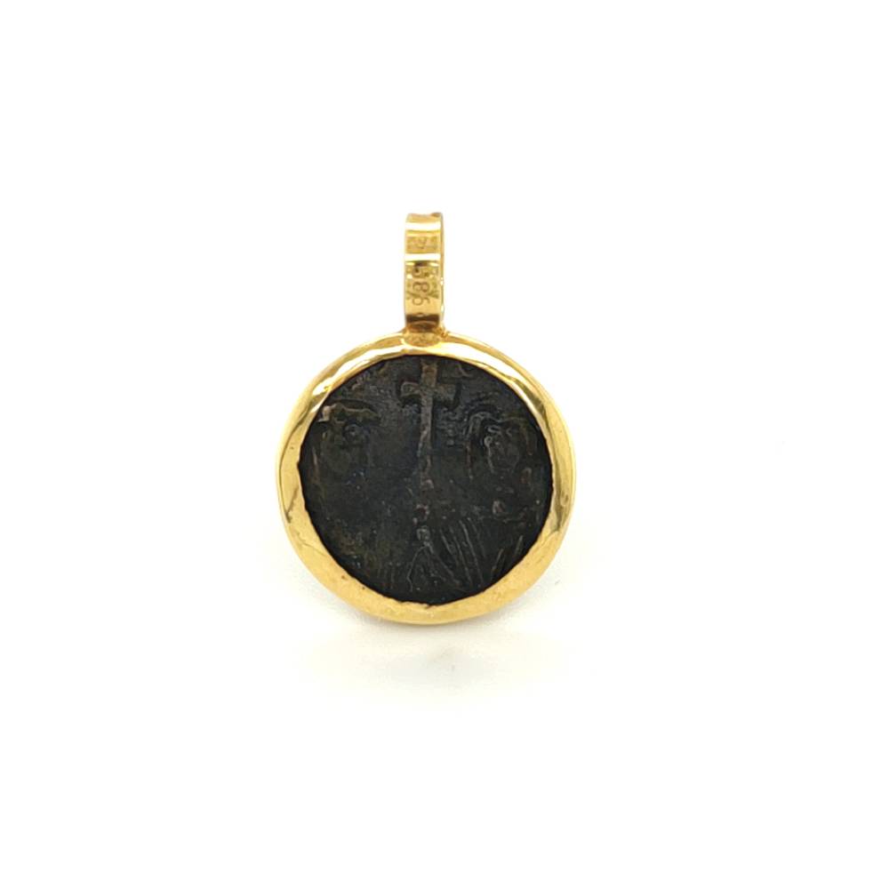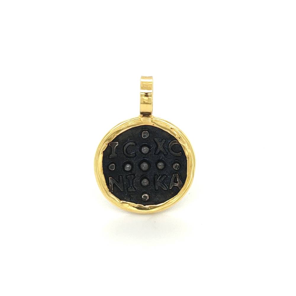 Ένα μενταγιόν φυλαχτό διπλής όψεως Κωνσταντινάτο, από χαλκό και στεφάνι από χρυσό K14 (585°).