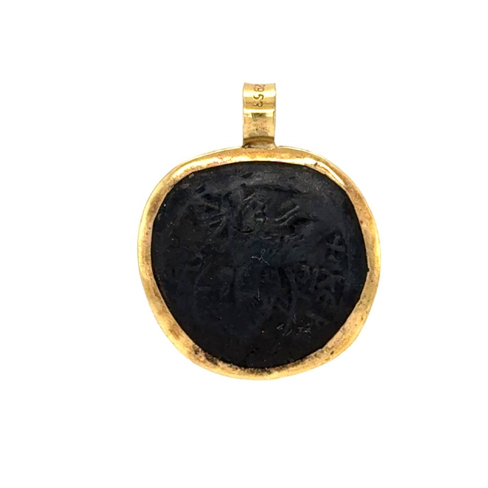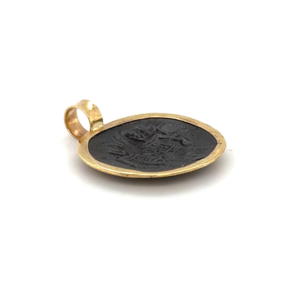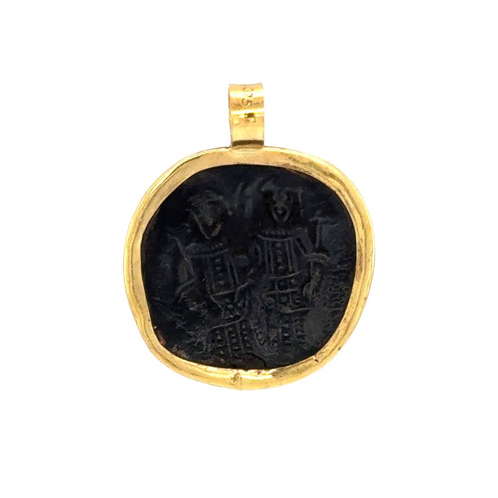 Ένα μενταγιόν φυλαχτό διπλής όψεως Κωνσταντινάτο, από χαλκό και στεφάνι από χρυσό K9 (375°).