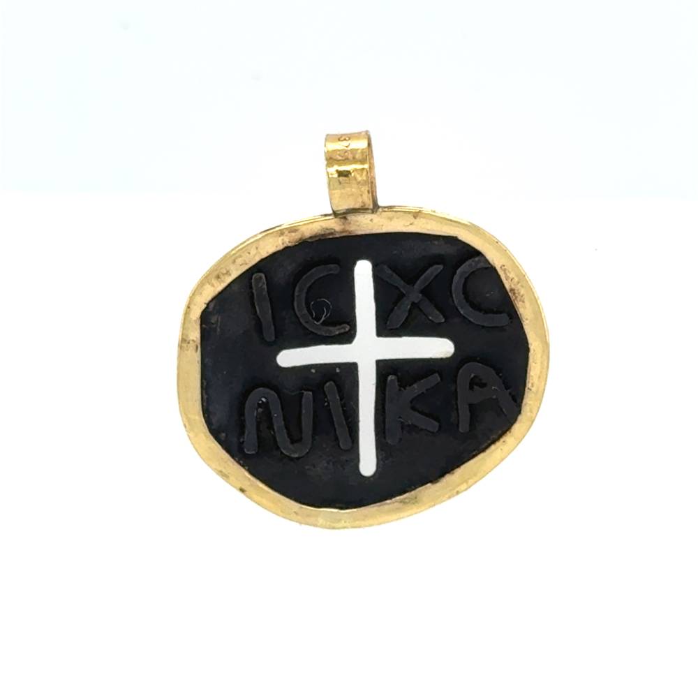 Ένα μενταγιόν φυλαχτό διπλής όψεως Κωνσταντινάτο, από χαλκό και στεφάνι από χρυσό K9 (375°).