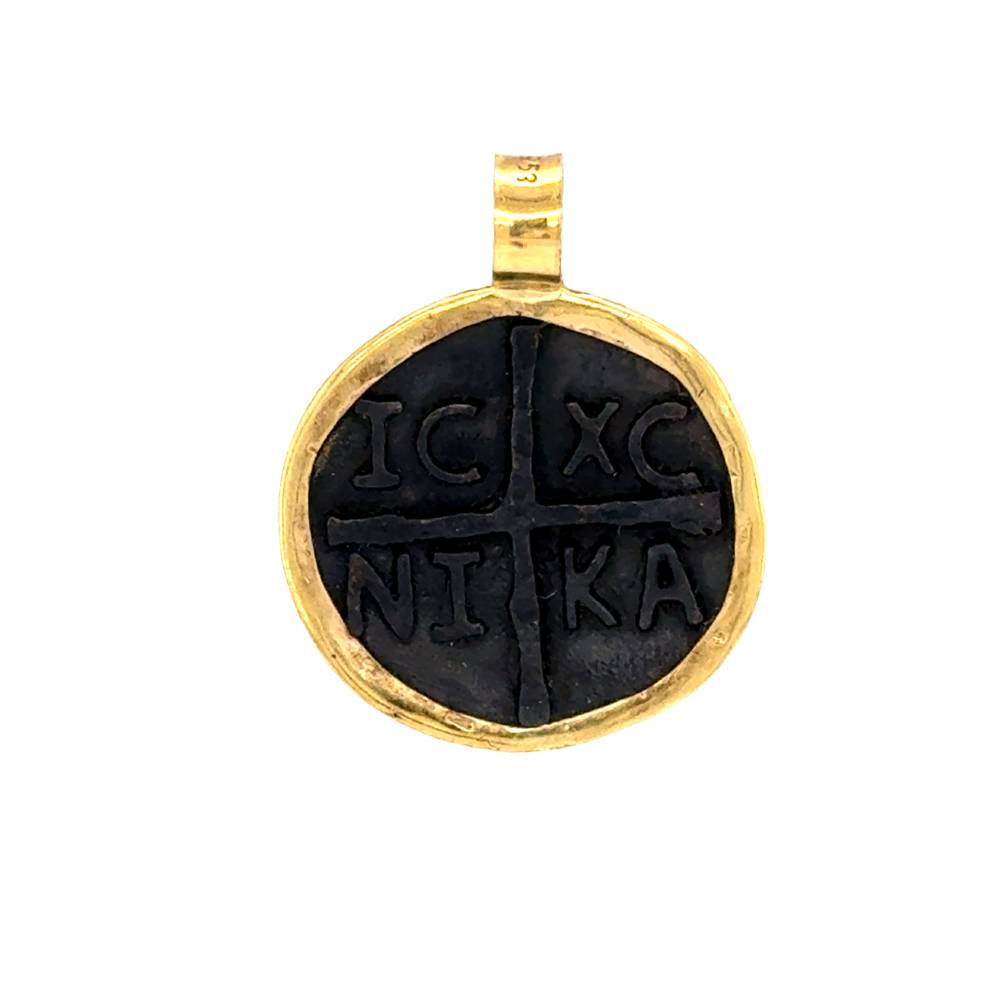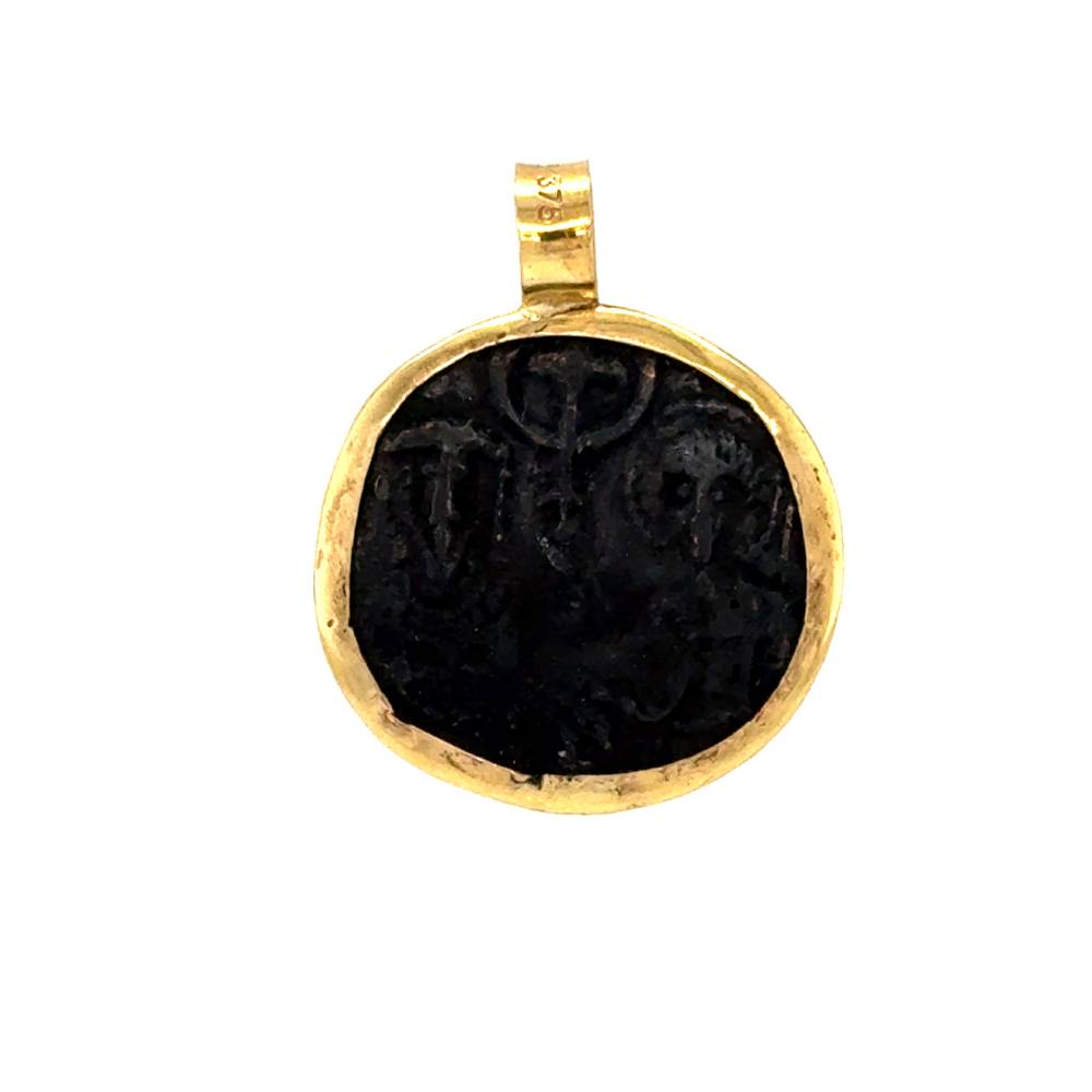 Ένα μενταγιόν φυλαχτό διπλής όψεως Κωνσταντινάτο, από χαλκό και στεφάνι από χρυσό K9 (375°).