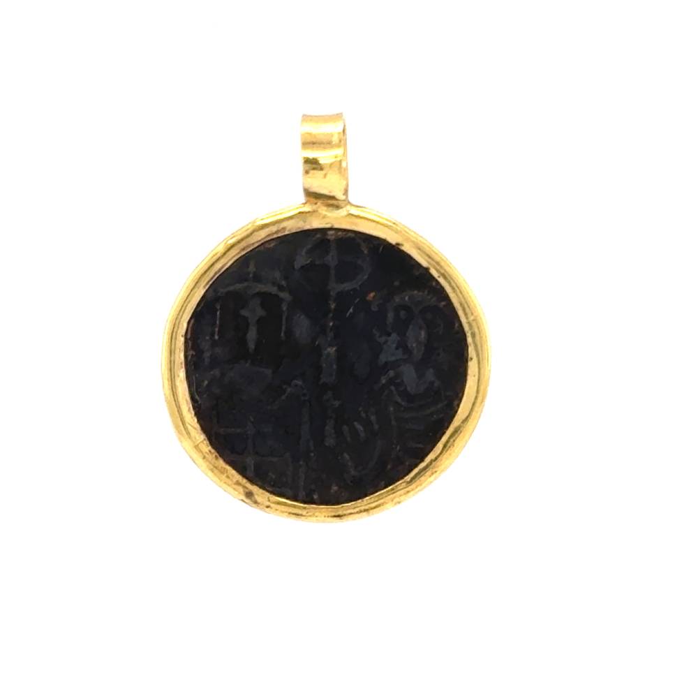 Ένα μενταγιόν φυλαχτό διπλής όψεως Κωνσταντινάτο, από χαλκό και στεφάνι από χρυσό K9 (375°).