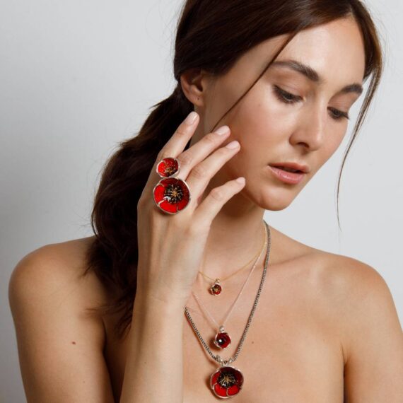 GIAMPOURAS COLLECTIONS Γυναικεία κολιέ παπαρούνα Red Poppy, ασήμι (925°) με σμάλτο