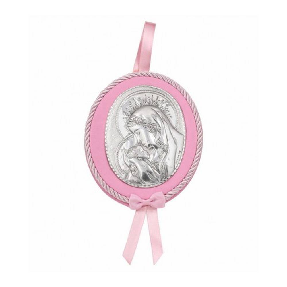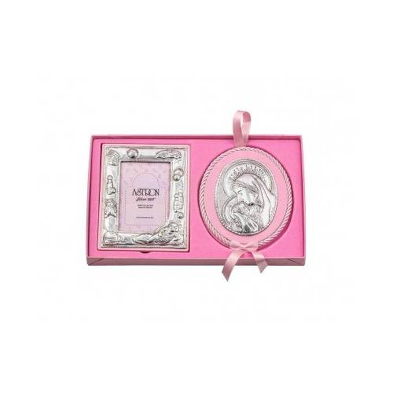 Gift set including a 12,3 x 10 cm pink icon of the Virgin Mary and a 6 x 9 cm silver (925°) photo frame with pink wooden back and support.