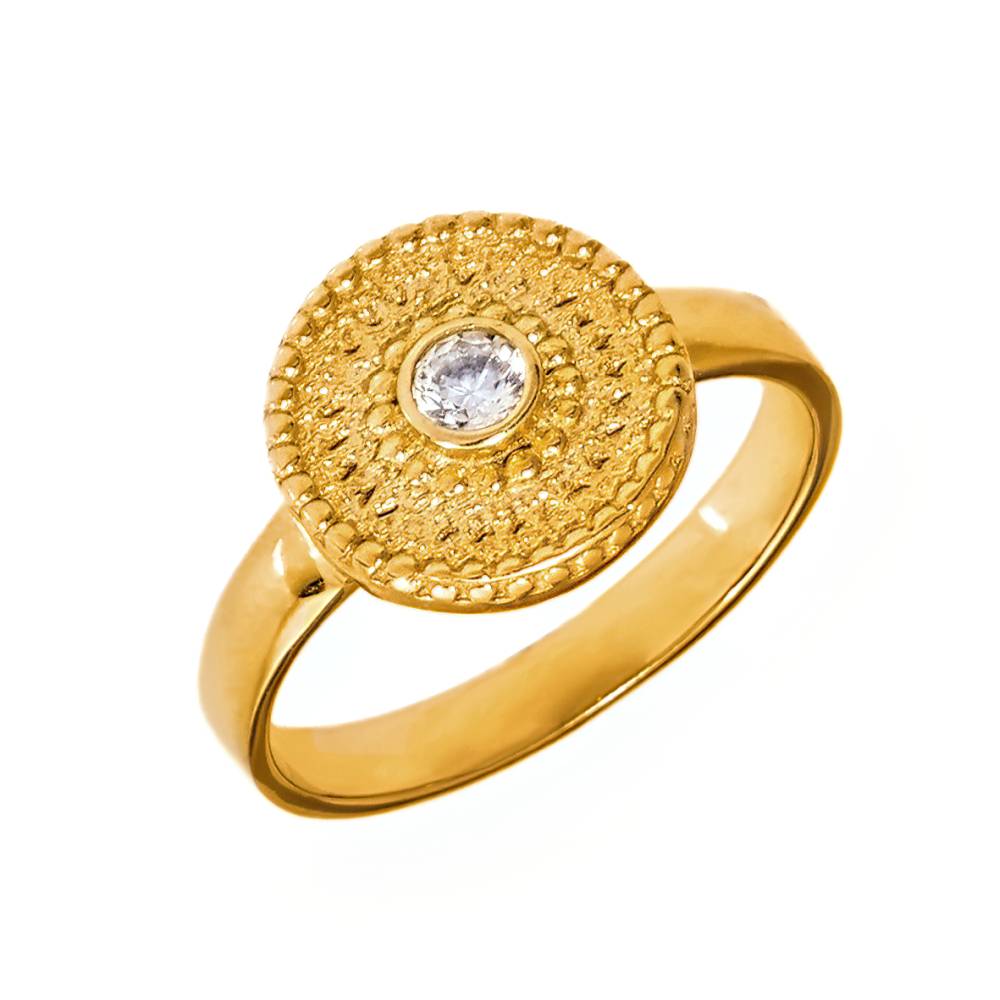 Ένα δαχτυλίδι της Gregio βυζαντινό με λευκό ζιργκόν, φτιαγμένο από ασήμι (925°) επιχρυσωμένο.
