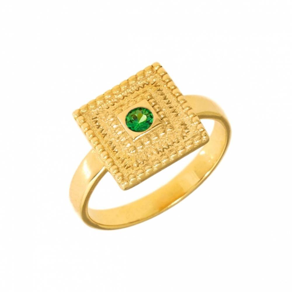 Ένα δαχτυλίδι της Gregio βυζαντινό με πράσινο ζιργκόν, φτιαγμένο από ασήμι (925°) επιχρυσωμένο.