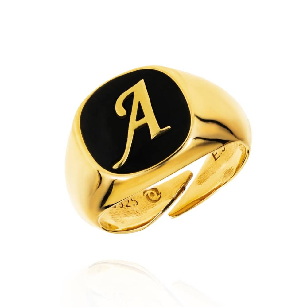 Σεβαλιέ γυναικείο δαχτυλίδι με το μονόγραμμα Α το οποίο στο εσωτερικό του έχει μαύρο σμάλτο. Το δαχτυλίδι είναι φτιαγμένο από επιχρυσωμένο ασήμι (925°).