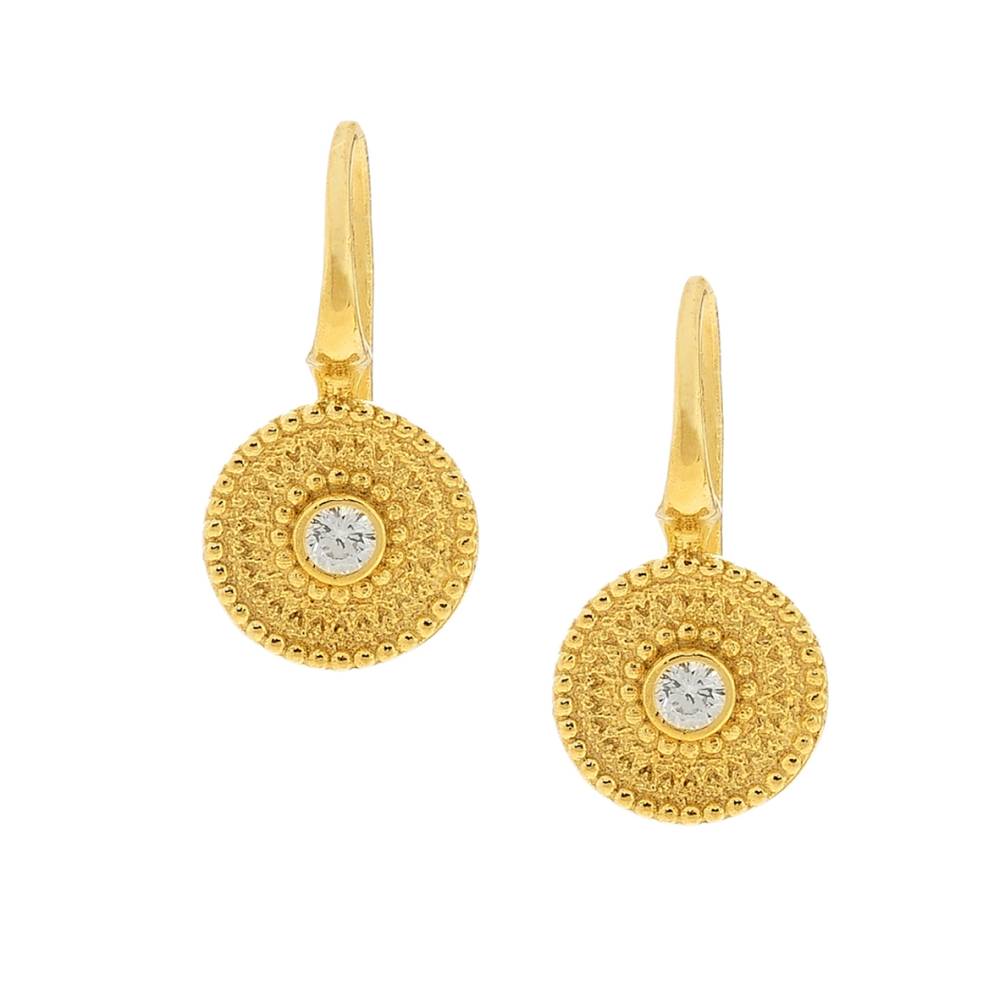 GREGIO Σκουλαρίκια βυζαντινά στρογγυλά κρεμαστά με λευκό ζιργκόν, επιχρυσωμένο ασήμι (925°)
