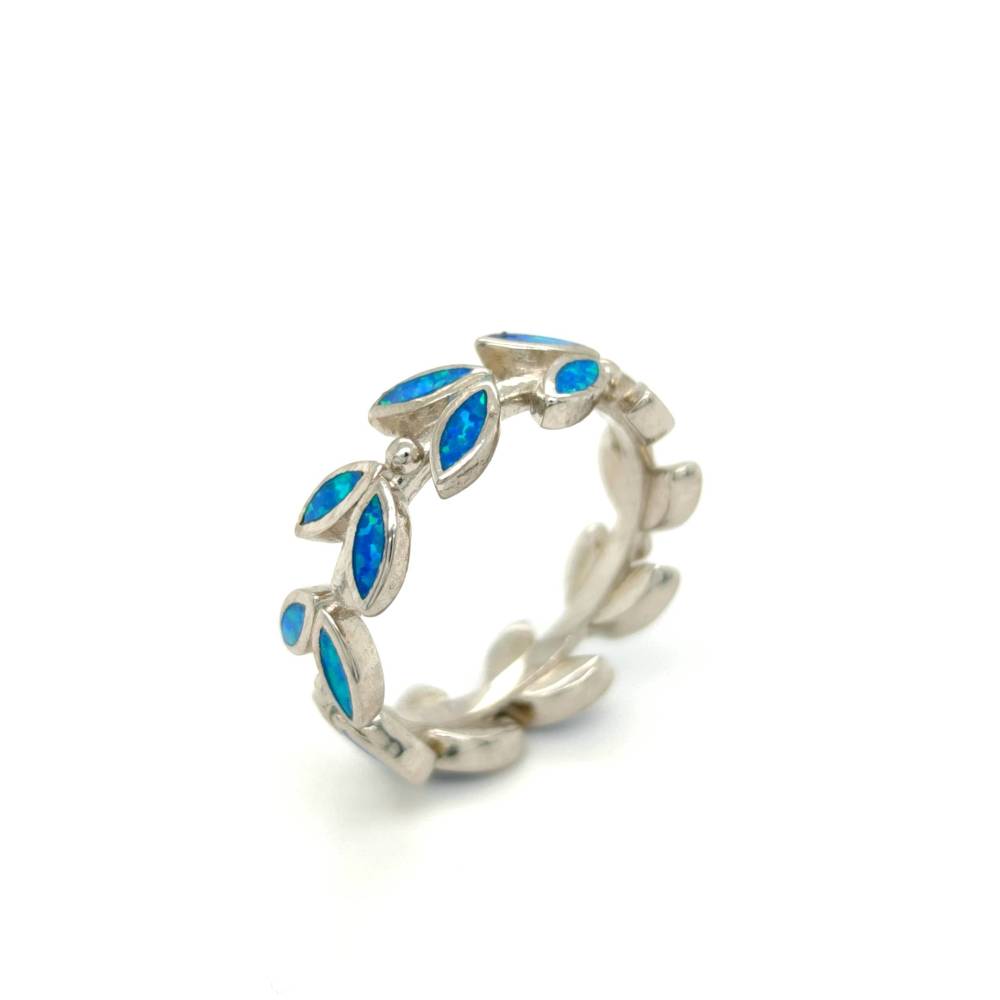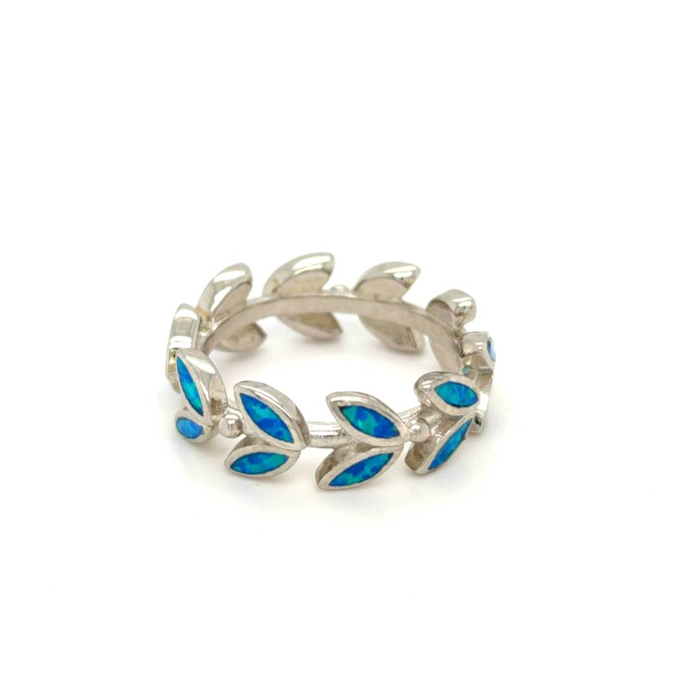 Γυναικείο δαχτυλίδι από επιροδιωμένο ασήμι (925°) με φύλλα ελιάς με τεχνητό opal. Η ελιά για τους αρχαίους Έλληνες ήταν σύμβολο των ολυμπιακών ιδεωδών, της Ειρήνης, της Σοφίας και της Νίκης. Γι’ αυτό και το μοναδικό βραβείο που έπαιρνε ο Ολυμπιονίκης ήταν ένα στεφάνι φτιαγμένο από κλαδί ελιάς, ο «κότινος».