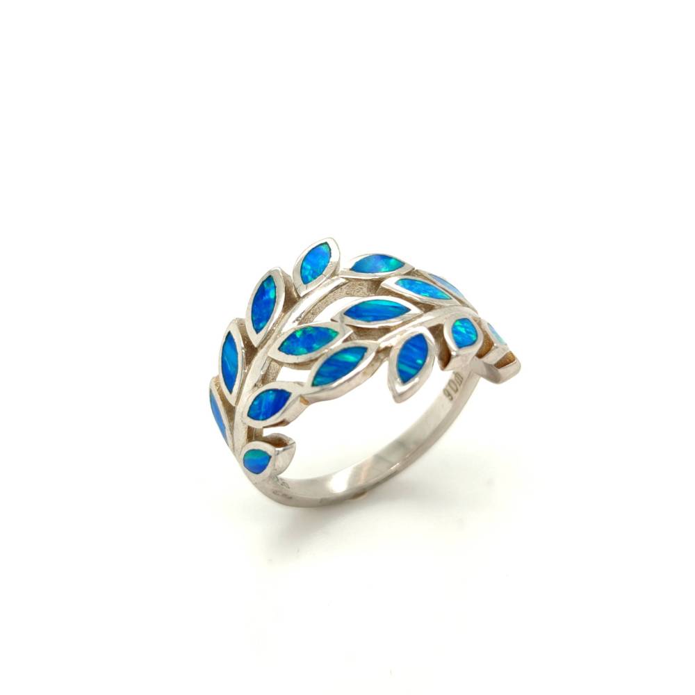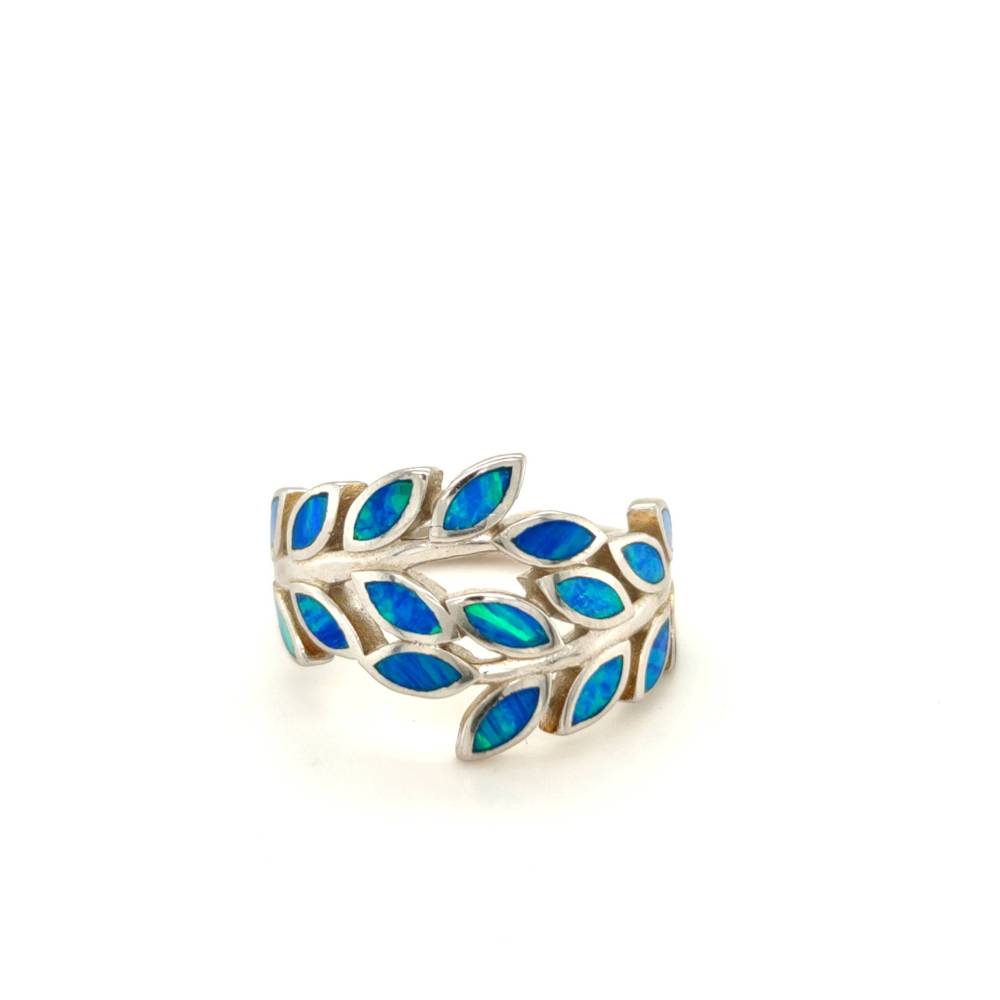 Γυναικείο δαχτυλίδι από επιροδιωμένο ασήμι (925°) με φύλλα ελιάς με τεχνητό opal. Η ελιά για τους αρχαίους Έλληνες ήταν σύμβολο των ολυμπιακών ιδεωδών, της Ειρήνης, της Σοφίας και της Νίκης. Γι’ αυτό και το μοναδικό βραβείο που έπαιρνε ο Ολυμπιονίκης ήταν ένα στεφάνι φτιαγμένο από κλαδί ελιάς, ο «κότινος».