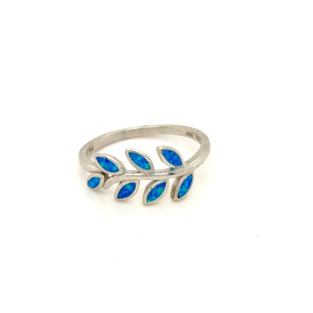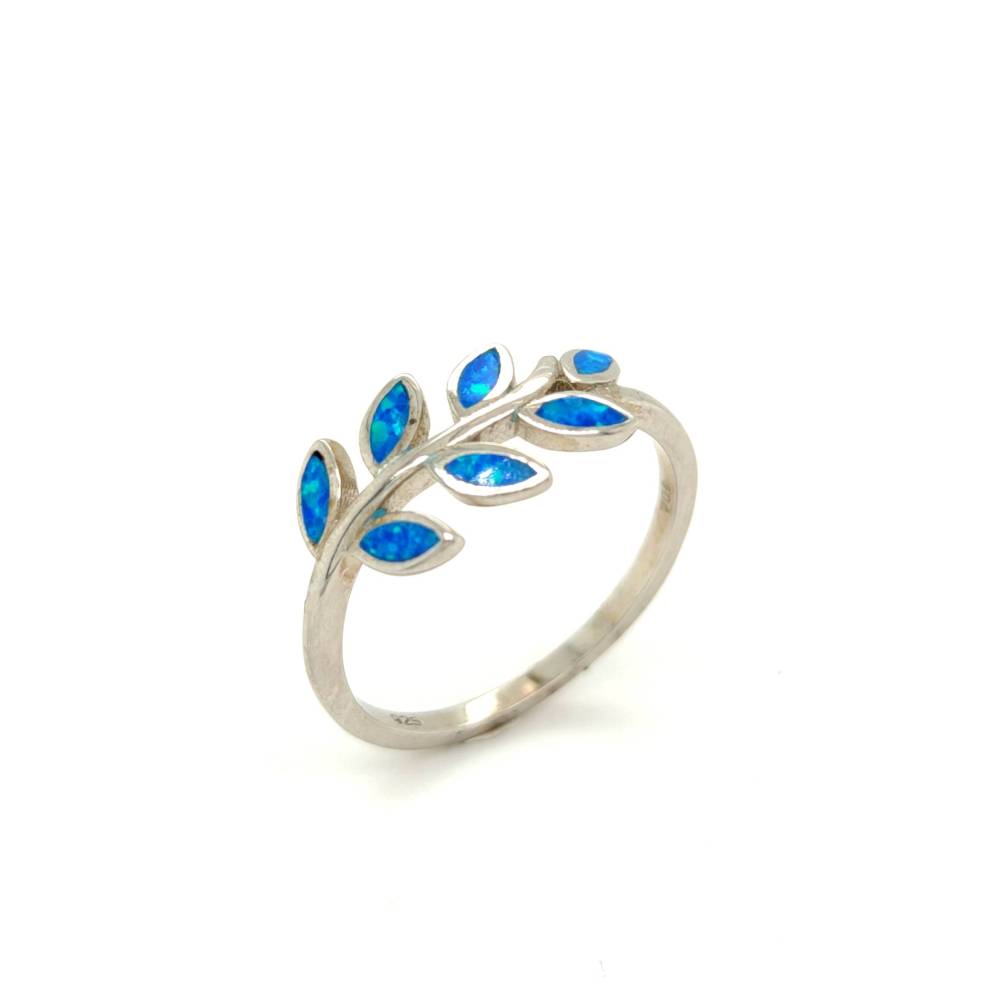 Γυναικείο δαχτυλίδι από επιροδιωμένο ασήμι (925°) με φύλλα ελιάς με τεχνητό opal. Η ελιά για τους αρχαίους Έλληνες ήταν σύμβολο των ολυμπιακών ιδεωδών, της Ειρήνης, της Σοφίας και της Νίκης. Γι’ αυτό και το μοναδικό βραβείο που έπαιρνε ο Ολυμπιονίκης ήταν ένα στεφάνι φτιαγμένο από κλαδί ελιάς, ο «κότινος».