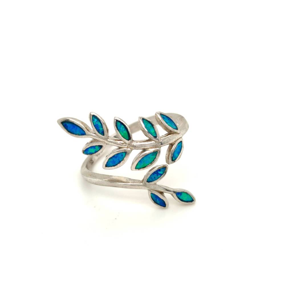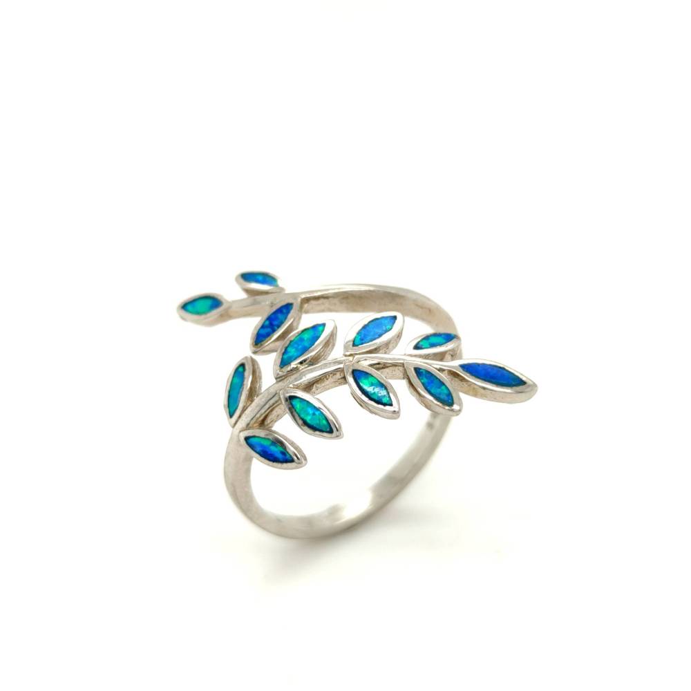 Γυναικείο δαχτυλίδι από επιροδιωμένο ασήμι (925°) με φύλλα ελιάς με τεχνητό opal. Η ελιά για τους αρχαίους Έλληνες ήταν σύμβολο των ολυμπιακών ιδεωδών, της Ειρήνης, της Σοφίας και της Νίκης. Γι’ αυτό και το μοναδικό βραβείο που έπαιρνε ο Ολυμπιονίκης ήταν ένα στεφάνι φτιαγμένο από κλαδί ελιάς, ο «κότινος».