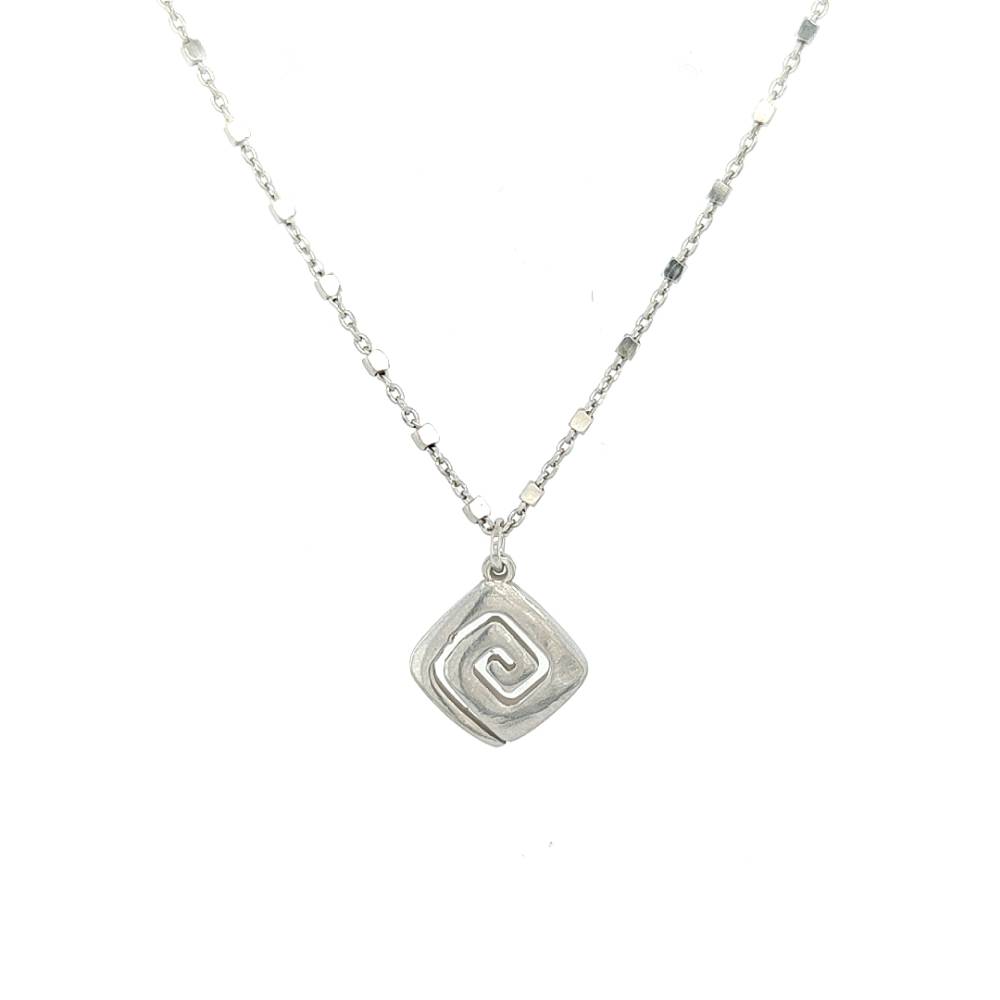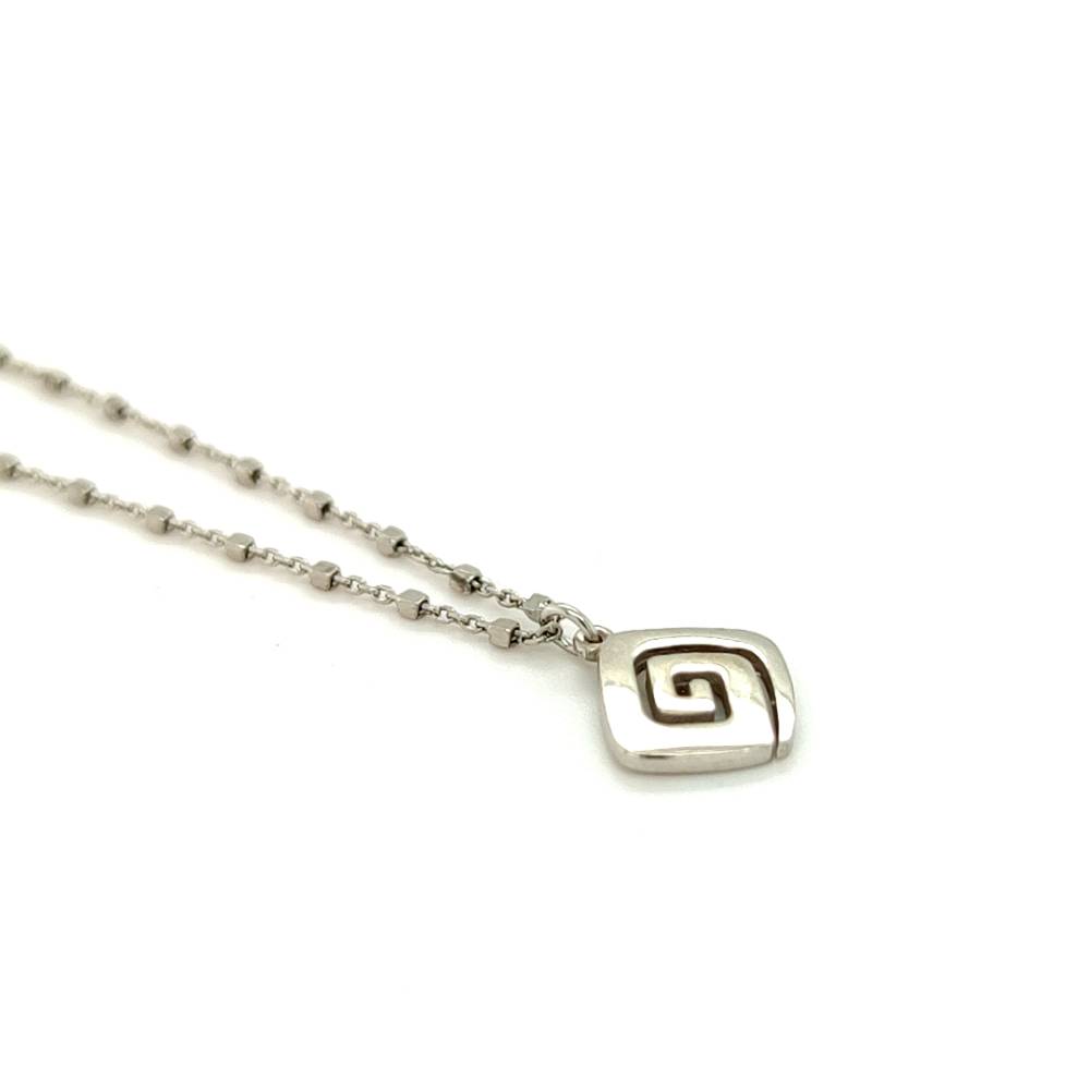 Γυναικείο κολιέ από ασήμι (925°) με αλυσίδα και στοιχειό μαίανδρου. Ο Μαίανδρος είναι το αρχαιότερο ελληνικό σύμβολο, Νίκης και Ενότητας, σύμβολο του Άπειρου και της Αιώνιας Ζωής. Εμπνευσμένος, κατά την άποψη κάποιων ακαδημαϊκών, από τις πολυάριθμες στροφές του ποταμού Μαιάνδρου. Ο Μαίανδρος χρησιμοποιείται σε αγγεία, ναούς, μνημεία, γλυπτά, αντικείμενα, πολεμικά όπλα, πανοπλίες και κοσμήματα.