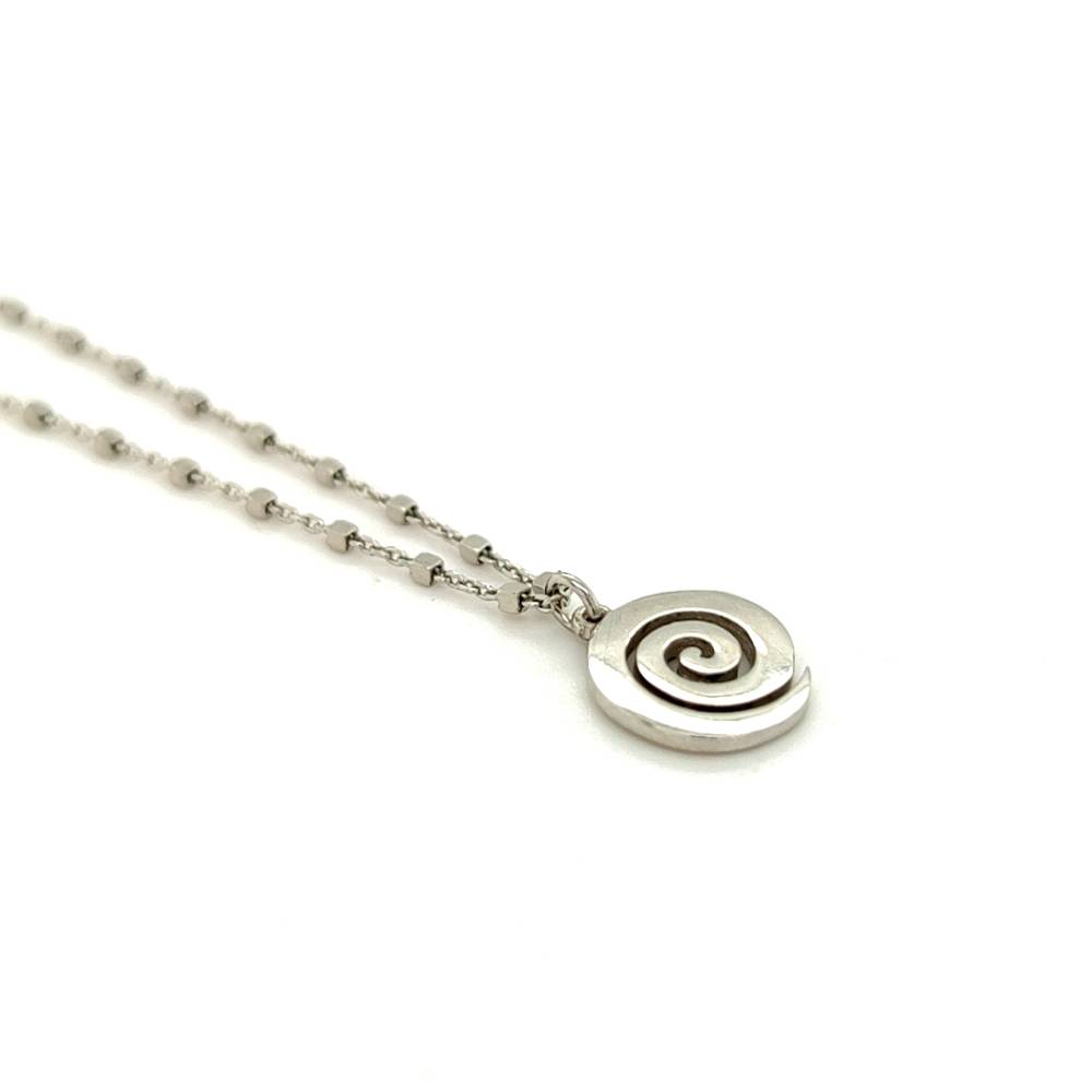 Γυναικείο κολιέ από ασήμι (925°) με αλυσίδα και στοιχειό σπείρα. Η Σπείρα είναι Αρχαιοελληνικό Σύμβολο Ζωής και είναι ένα από τα αρχαιότερα σύμβολα και χρησιμοποιείται από την παλαιολιθική εποχή στον Ελλαδικό χώρο. Ένα από τα πιο μυστηριώδη γεωμετρικά σχέδια που βρίσκουμε σε όλο τον πλανήτη. Έχει εντοπιστεί σε αμέτρητους αμφορείς, αγάλματα, κοσμήματα και σε πολλά άλλα αντικείμενα.