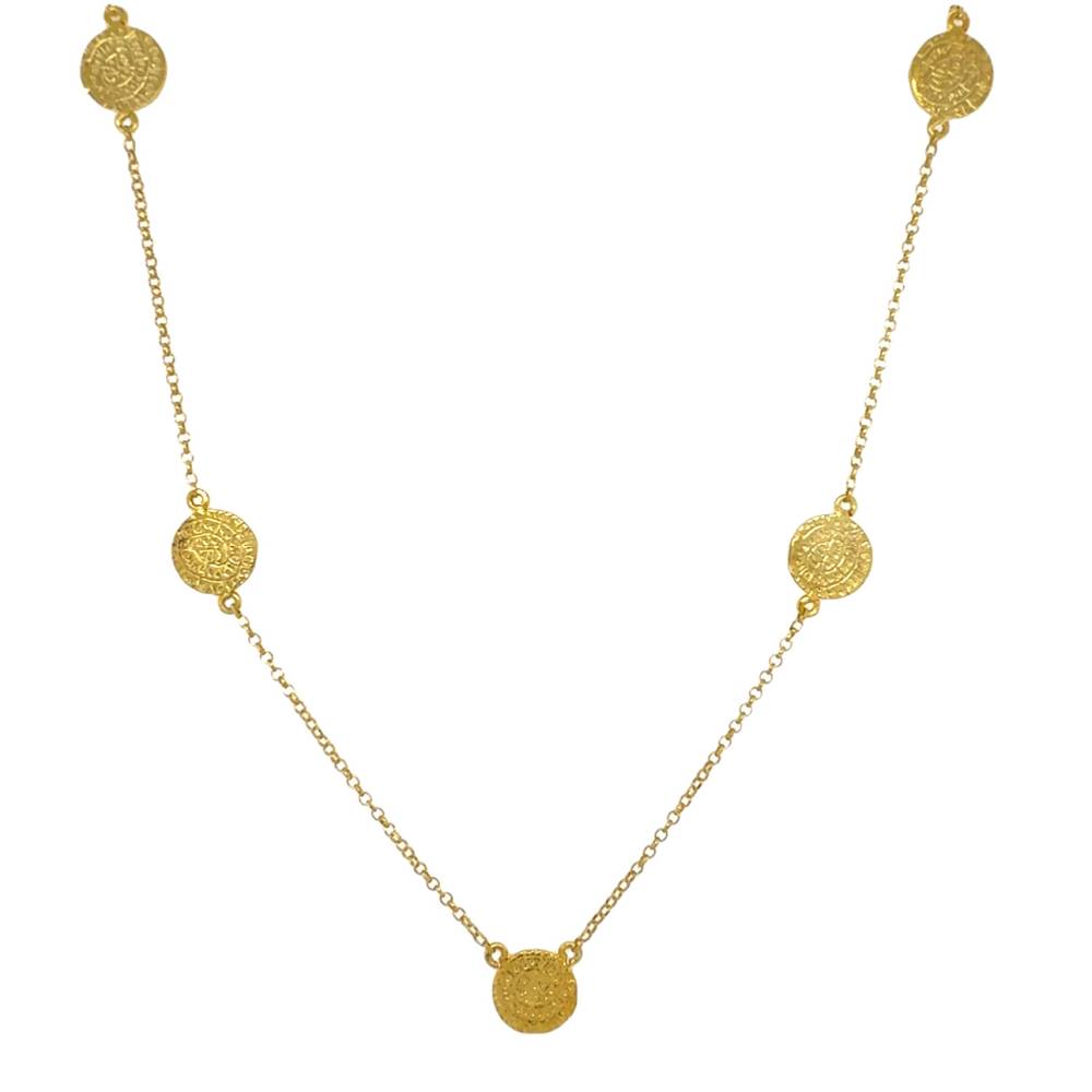 Γυναικείο κολιέ από ασήμι (925°) επιχρυσωμένο με το Δίσκο της Φαιστού. Ο Δίσκος της Φαιστού είναι δίσκος ψημένου πηλού, που αποτελεί αρχαιολογικό εύρημα από τη Μινωική πόλη της Φαιστού στη νότια Κρήτη και χρονολογείται πιθανώς στην μέση ή ύστερη Μινωική Εποχή του Χαλκού. Αποτελεί ένα από τα γνωστότερα μυστήρια της αρχαιολογίας, αφού ο σκοπός της κατασκευής του παραμένει άγνωστος. Άγνωστο είναι μέχρι σήμερα και το νόημα των αναγραφόμενων σε αυτόν.