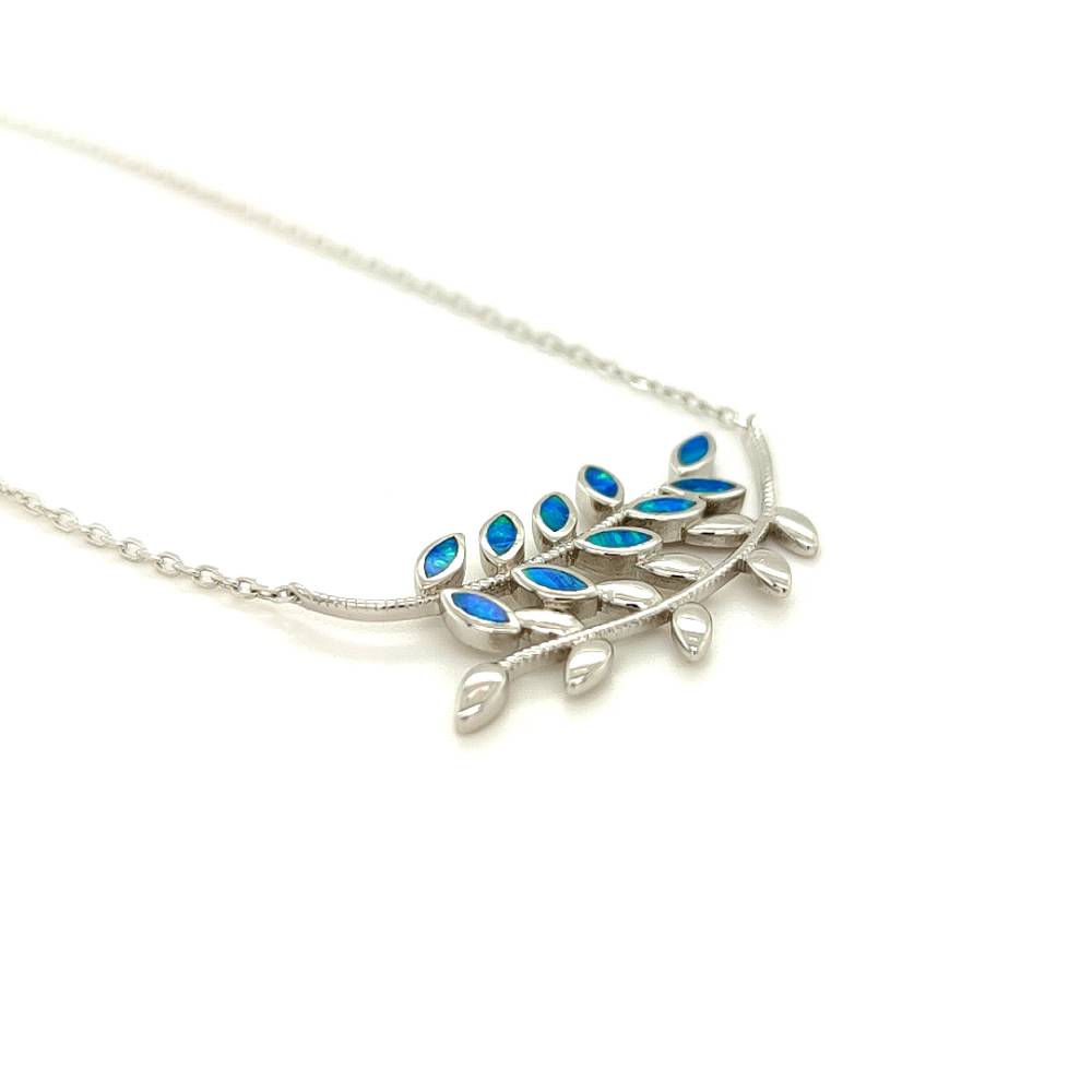Γυναικείο κολιέ από ασήμι (925°) με φύλλα ελιάς με τεχνητό opal. Η ελιά για τους αρχαίους Έλληνες ήταν σύμβολο των ολυμπιακών ιδεωδών, της Ειρήνης, της Σοφίας και της Νίκης. Γι’ αυτό και το μοναδικό βραβείο που έπαιρνε ο Ολυμπιονίκης ήταν ένα στεφάνι φτιαγμένο από κλαδί ελιάς, ο «κότινος».