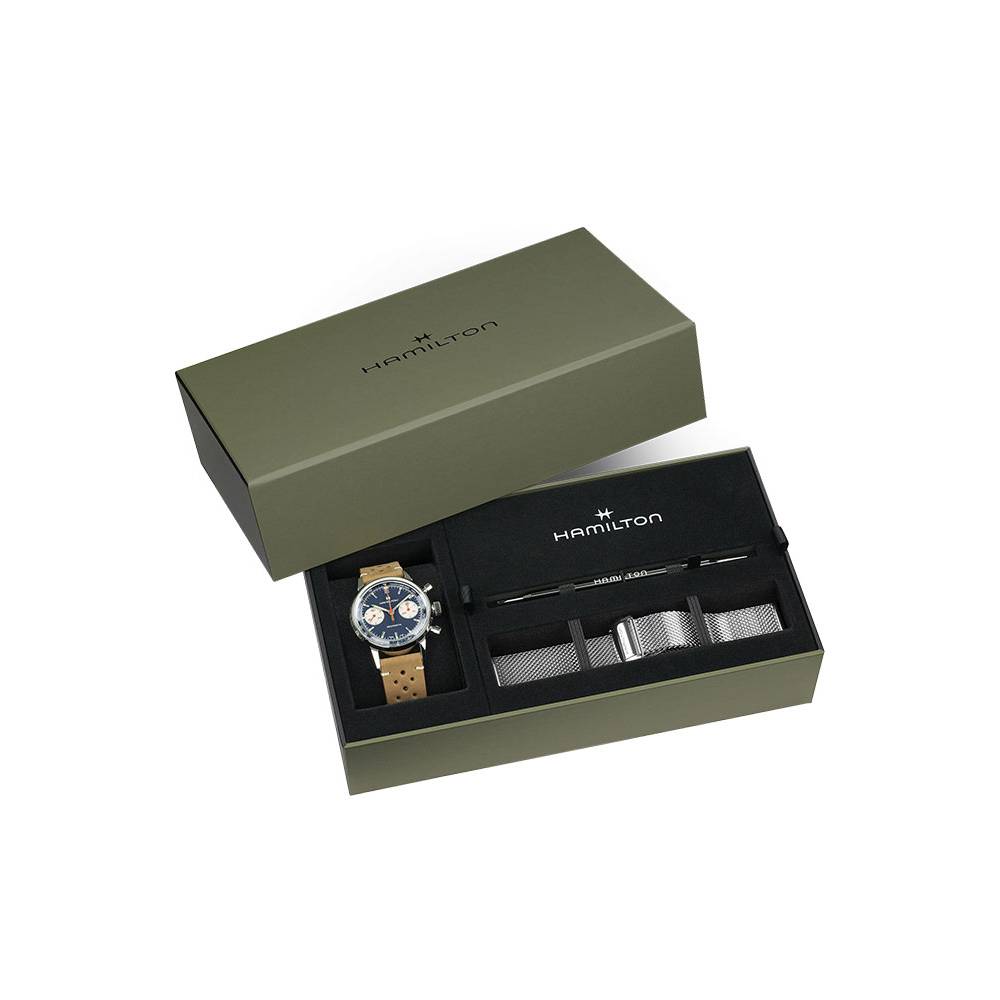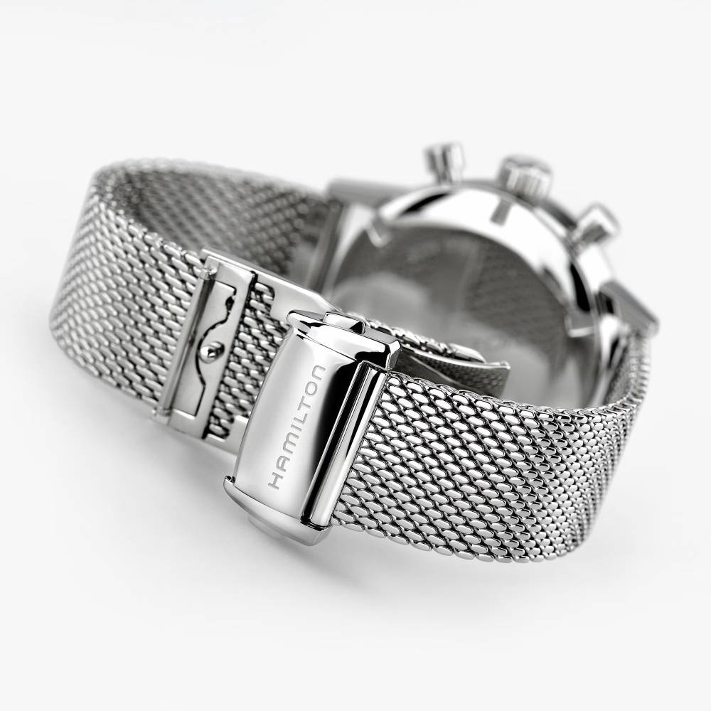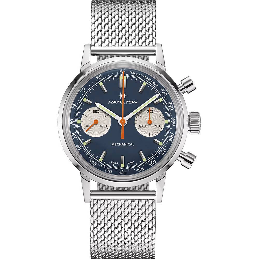 Dynamic and daring, the American Classic Chronograph 40mm featuring a blue dial with orange chronograph hands channels the energy of 60s and 70s racing culture. Its vibrant color pairing makes a striking impression, complemented by a perforated strap for an authentic motorsport feel. Paired with a second versatile mesh bracelet delivered in a bundle packaging, this automatic chronograph is built for those who live life at full throttle.