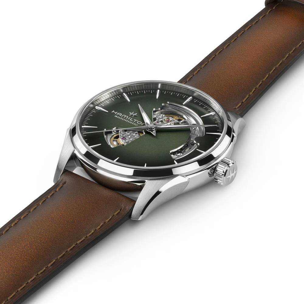 Offering a glimpse of its powerful inner mechanics, the Jazzmaster Open Heart lets precision take center stage with a new 42mm dial. Featuring a stunning gradient colour effect in rich green, this timepiece reveals its subtle beauty and showcases Hamilton’s ever-evolving craftsmanship and attention to detail. Bringing the H-10 automatic movement into the spotlight, with an 80 hour power reserve and Nivachron™ balance spring, the Jazzmaster Open Heart Auto is fitted with a timeless, smoky brown leather strap.