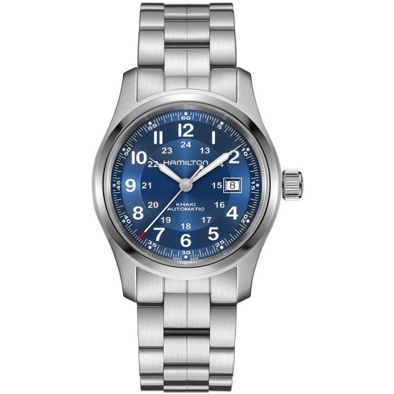 Inspired by the original soldiers’ watch, the Khaki Field Automatic blends military heritage with contemporary design and offers versatility for modern pioneers. Pairing a navy sunray dial with a snailing effect on the hour ring, the dial reflects light whilst boasting texture and depth. Designed for action and built for adventure, the exclusive H-10 automatic caliber offers up to 80 hours of power reserve, ensuring it won’t let you down. Discover our Khaki Field collection.