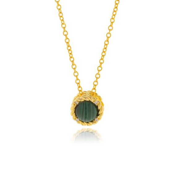 Γυναικείο κολιέ με λευκό ζιργκόν και μια κεντρική πέτρα σε χρωματισμό Μαλαχίτη, το οποίο είναι φτιαγμένο από επιχρυσωμένο ασήμι (925°).
